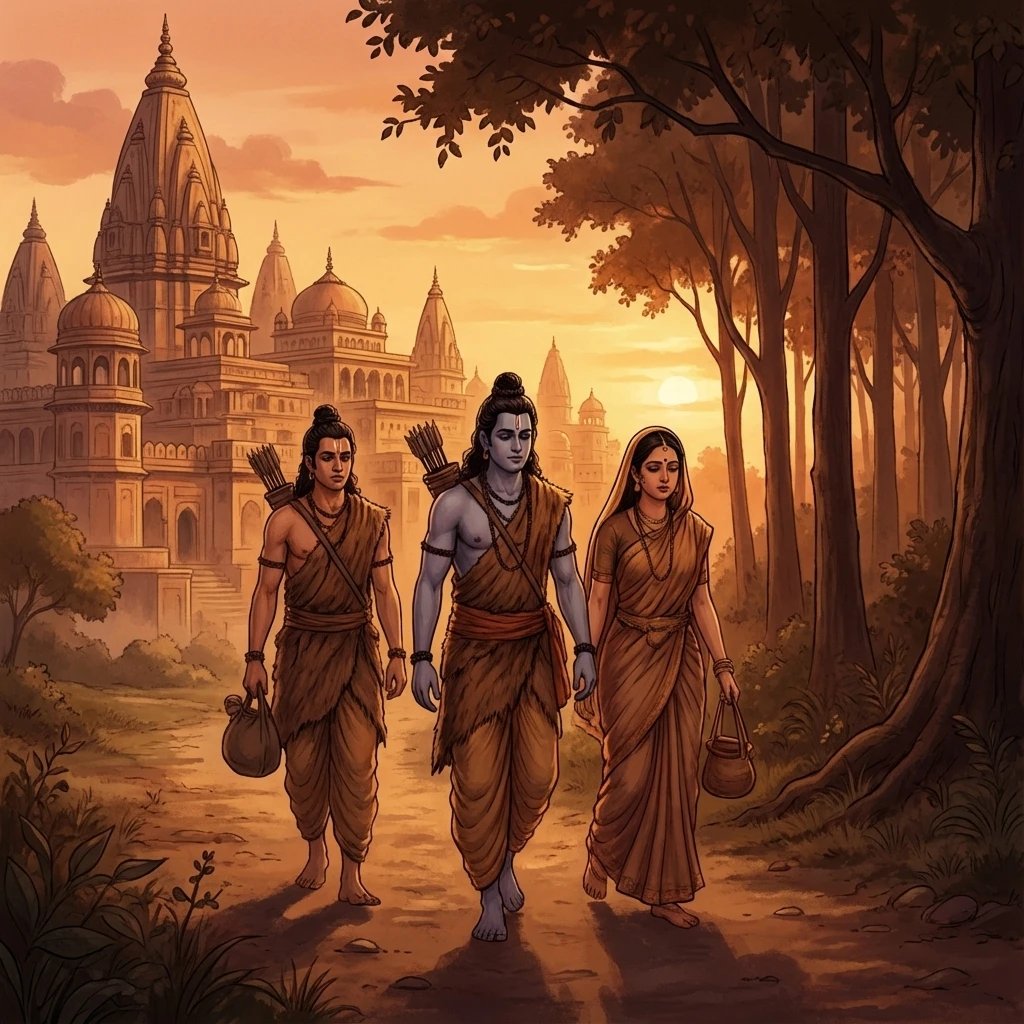 Daśaratha announces Rāma’s coronation; Ayodhyā prepares in joy. Mantharā incites Kaikeyī to demand two boons: Bharata’s enthronement and Rāma’s fourteen-year exile. Bound by promise, Daśaratha yields; Rāma accepts without protest, Sītā insists on accompanying him, and Lakṣmaṇa follows. Amid public grief and ominous signs, the trio departs, meets Guha, crosses the Gaṅgā, and receives guidance from Bharadvāja, settling at Citrakūṭa. In Ayodhyā, Daśaratha dies in remorse; ministers summon Bharata, who condemns Kaikeyī, rejects the throne, and sets out to bring Rāma back, carrying coronation materials toward the forest.