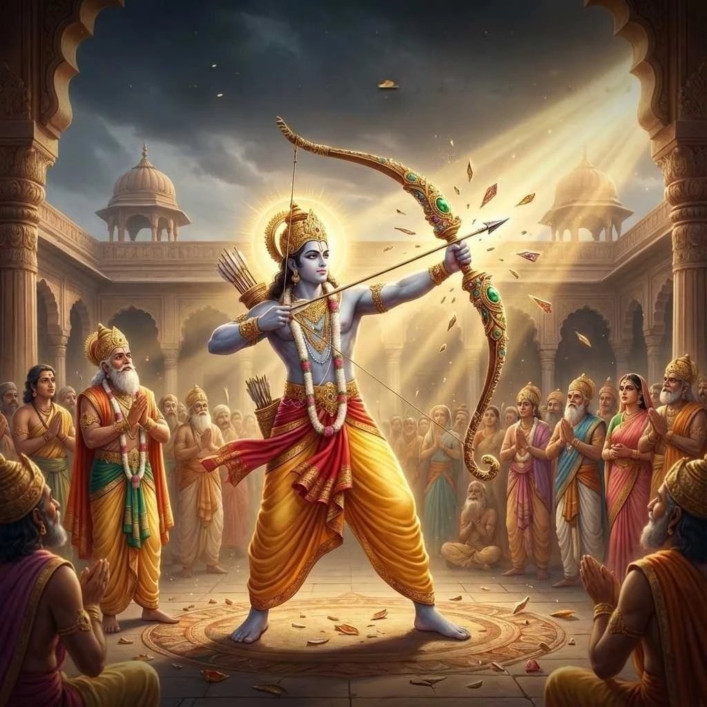 शिवधनुर्दर्शनं—रामेण धनुर्भङ्गश्च (The Showing of Śiva’s Bow and Rama’s Breaking of It)