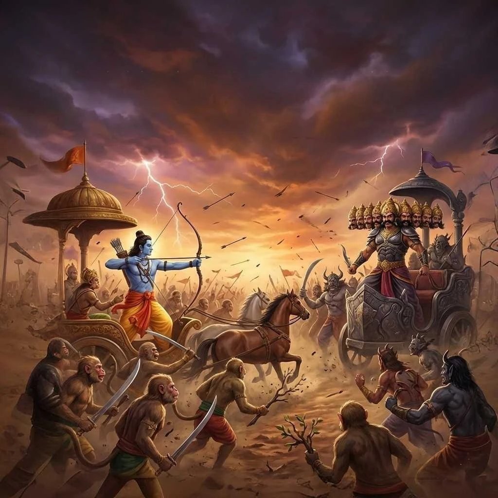 राघव-रावणयोः घोर-द्वैरथ-युद्धम् (The Fierce Chariot-Duel of Rama and Ravana)