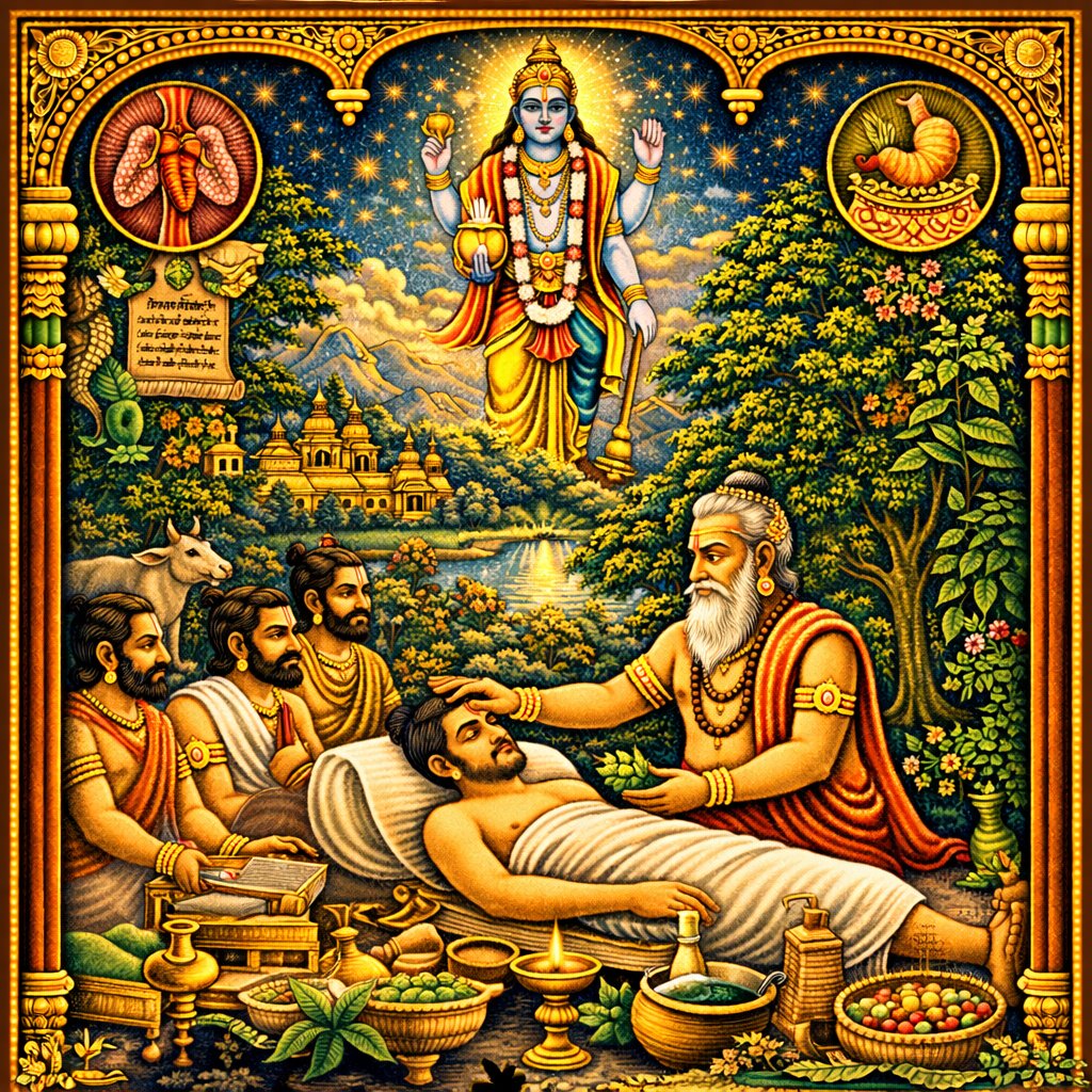 A compendium of Ayurvedic medicine covering diagnosis, treatment, herbal remedies, surgical principles, and preventive healthcare.