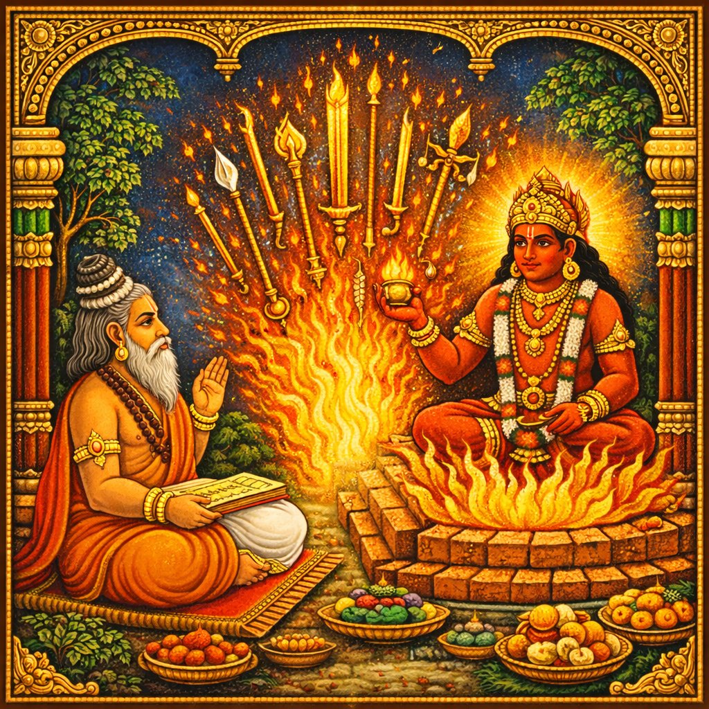Start ReadingThe Agni Purana is one of the eighteen Mahapuranas, unique among them for its encyclopedic breadth. Narrated by Agni (the fire god) to the sage Vasishtha, it is less a narrative text and more a comprehensive compendium of sacred knowledge. It covers an extraordinary range of subjects: from the avataras of Vishnu and creation myths to temple architecture (vastu-shastra), Ayurvedic medicine, Sanskrit grammar (vyakarana), literary theory (sahitya-shastra), prosody (chhandas), astrology (jyotisha), martial science (dhanurveda), governance (raja-dharma), and the ultimate path of yoga and Brahma-vidya. It is often called the "encyclopedia of ancient Indian knowledge" within the Puranic tradition.