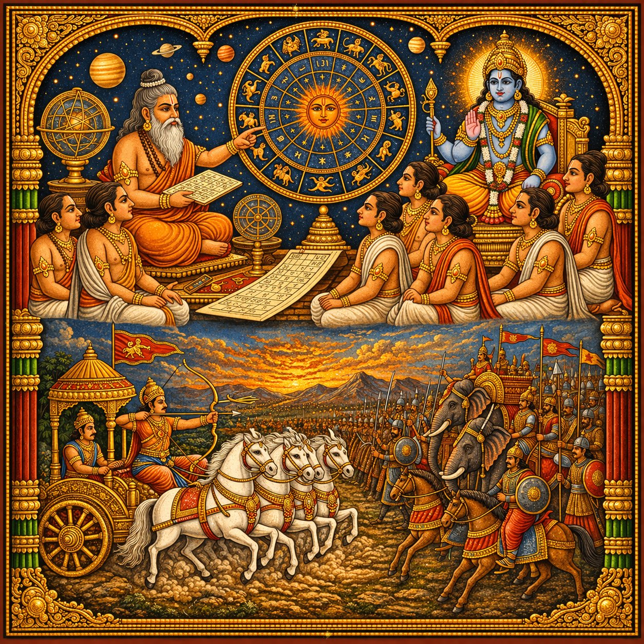 Covers Vedic astrology (jyotisha) including planetary movements, omens, and muhurtas alongside military strategy and the science of warfare victory.