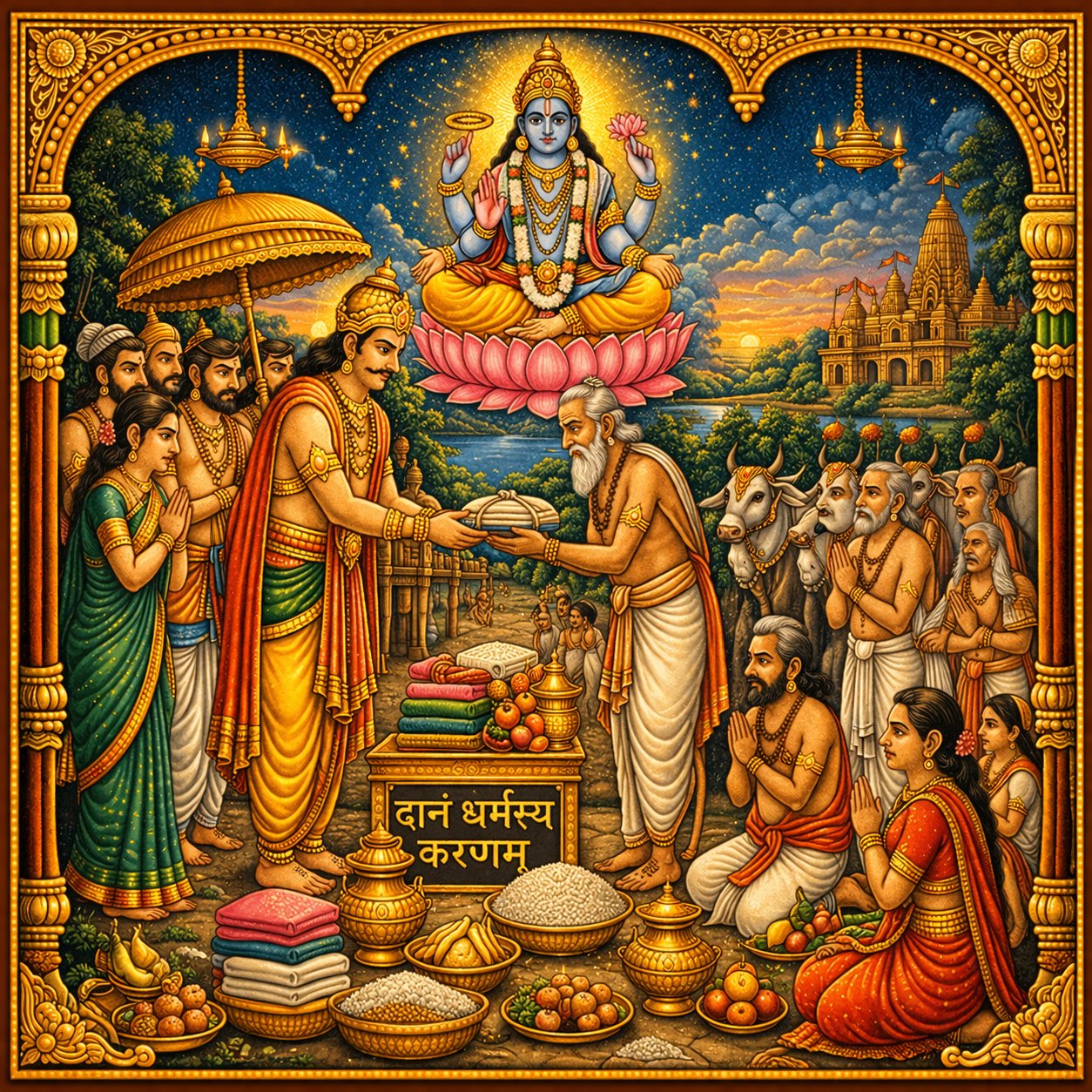 The greatness and merit of various forms of charity (dana) including go-dana, anna-dana, vidya-dana, and their fruits in this life and beyond.