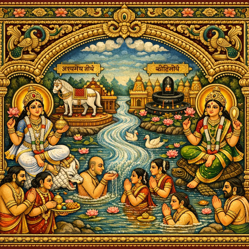 كوṭيتيرثا، وأشفاميدها(-تيرثا)، والملتقى الأسمى للغانغا واليامونا، وماناسا-تيرثا الخالي من الراجس (الدنس)، وكذلك فاساراكا-تيرثا المتعالي—كلها تُعلَن كمخاضات مقدّسة جليلة.