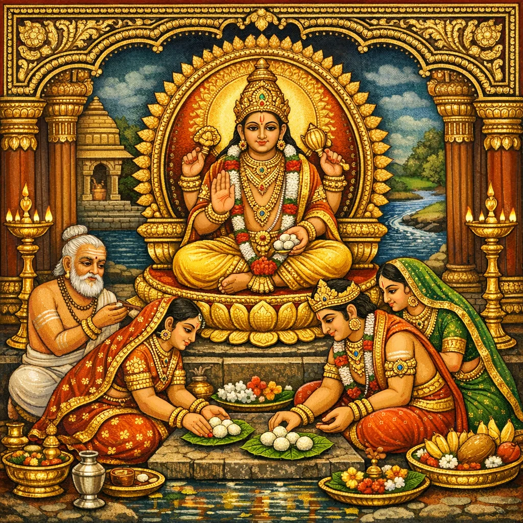 في البدء، بحضرة الإلهة وأمام غَدادهارا (Gadādhara—Viṣṇu)، ينبغي أولًا السجود لمونْدَپْرِشْثا (Muṇḍapṛṣṭha) مع كْشيتْرَپالا (Kṣetrapāla) وسائر الآلهة المرافقة الحارسة.