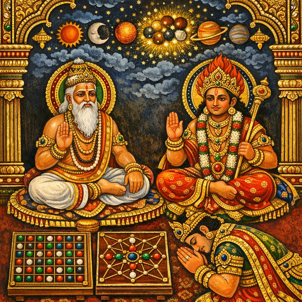 يُعلِّم الربّ أغني (بوصفه إيشڤارا في سرد هذا الفصل) نظامًا مُنظَّمًا لاتخاذ القرار في شؤون الحرب قائمًا على علم الجيوتيشا ضمن «يُدّهاجيايارنَڤا». يبدأ التعليم ببناء مخططاتٍ دورية: تُوضَع الحروف الصوتية بحسب الجهات في ترتيبٍ مع عقارب الساعة، وتُدار أشهر السنة على عجلة ابتداءً من «تشيترا»، وتُعلَّم التيثي من «براتيبَت» إلى «بورنِما». وتُقاس السعدية عبر «اتصالات» مخصوصة في دورة تشيترا؛ فالتراكيب غير المتساوية/الفردية محمودة، والمتساوية/الزوجية مذمومة. ثم يربط الفصل النصر والهزيمة بمنطق nāma-akṣara وبـsvara (الصوت القصير/الطويل): فموضع الوزن الشعري وصعود الحروف الصوتية في أول القول أو آخره يُقرأ كفألٍ بالموت أو بالظفر. ويُوصَف «ناراشاكرا» بوصفه تجمّعًا للنكشترَات يُسقَط على هيئة جسدية عبر مواضع النْياسا (الرأس، الفم، العينان، اليدان، الأذنان، القلب، القدمان، والموضع السري). وتُذكر تركيبة قاتلة حين يشترك الشمس في نكشترة واحدة مع زحل والمريخ وراهُو. وأخيرًا يُرسَم «جايَشاكرا» بكتابة الحروف ورسم الشبكات الخطية، مع إسناد الفئات الكونية (الجهات، الكواكب graha، الحكماء، التيثي، النكشترَات، وغيرها)، وحساب مجاميع مشتقة من الاسم تُقسَم على ثمانية (الفَسُو)، وترتيب القوى النسبية عبر حيوانات رمزية—لتتكوّن خلاصة تحليلٍ لعلامات الحرب متجذّرة في «أغنيّا ڤيديا».