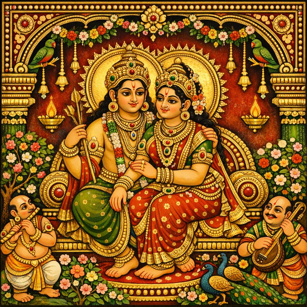 الجمال (śobhā)، والرشاقة المرِحة (vilāsa)، والعذوبة (mādhurya)، والثبات (sthairya)، والعمق (gāmbhīrya)، والرقة الأنيقة (lalita)، والسخاء (audārya)، وtejas—البهاء والقوة—هذه الثمانية تُسمّى pauruṣa، أي الفضائل الذكورية البطولية.