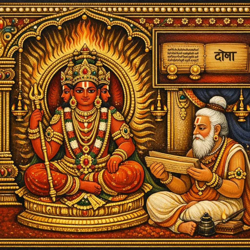 تعمل الجملة الافتتاحية هنا كمفصلٍ نصّي: فهي تُغلق الأدهيايا السابقة في صفات الشعر (guṇa) وتفتتح فورًا الأدهيايا التالية في عيوبه (doṣa). وفي سياق التعليم بين أغني–فَسِشْتَه، يعكس هذا الانتقال منهج الشاسترا في التحليل المزدوج: تثبيت ما يُكوّن الامتياز في الكافيا أولًا، ثم تعريف ما يُكدّر التذوّق الجمالي ويُضعف قبول أهل العلم. ويؤكد الخاتمة/الكولوفون ترتيب البورانا الموسوعي: إذ تُعامل نظرية الشعر كـ vidyā صارمة إلى جانب سائر العلوم الفنية، ويُصوَّر الانتقال من guṇa إلى doṣa الشعرَ ممارسةً منضبطة تحكمها قواعد النحو، والعرف، ووضوح المعنى. ومن ثم فالحكم على الشعر ليس ذوقًا شخصيًا محضًا، بل يرتكز على جمهورٍ مُهذَّب (sabhya)، وعلى علم اللفظ الصحيح (śabda-śāstra)، وعلى الاستعمال المعياري (samaya)، بما يوافق الصنعة الأدبية مع الدharma وتهذيب العقل.