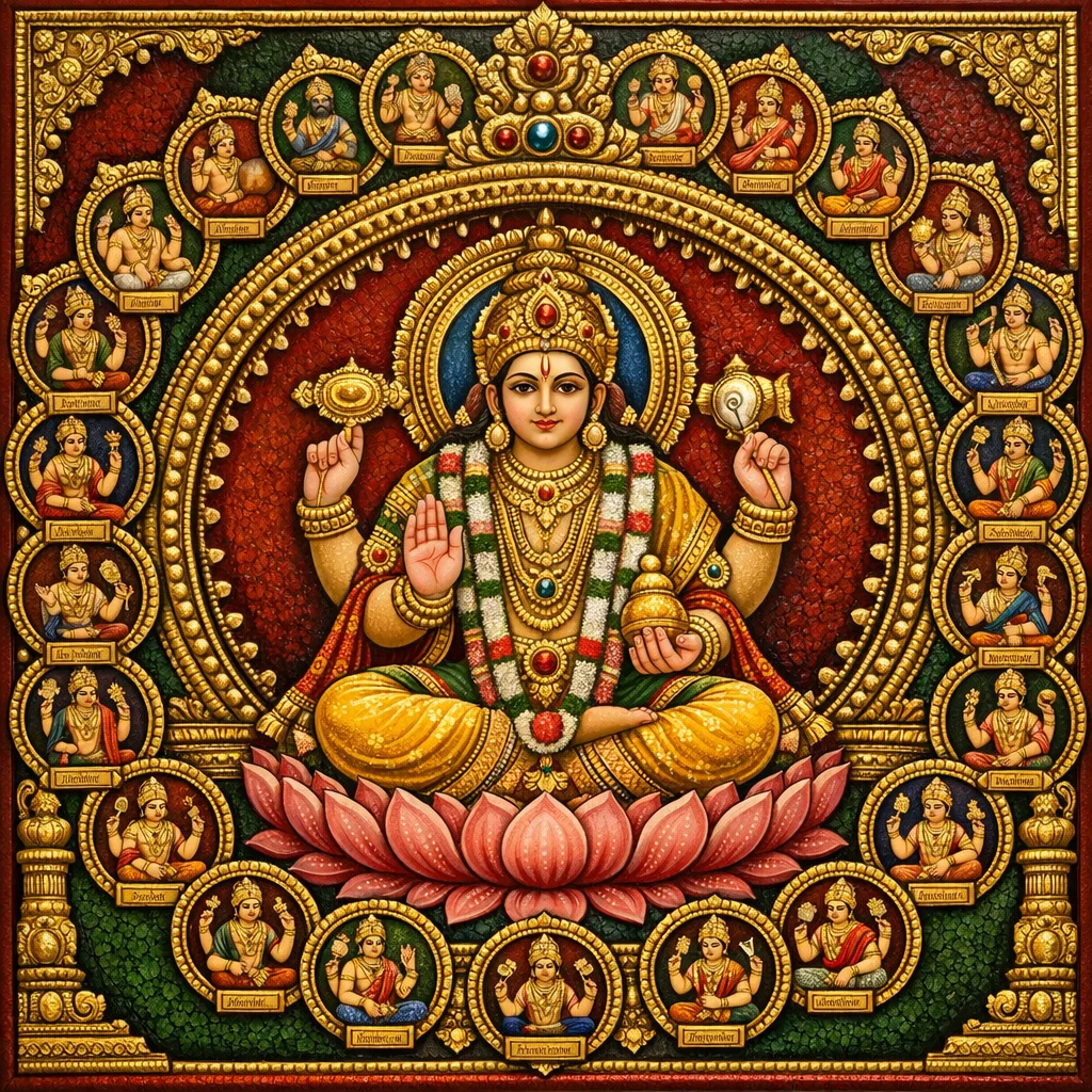 أنحني ساجدًا له—فارَدا، واهبُ النِّعَم؛ بادمانابها، ذو السُّرّة اللوتسية؛ حاملُ الصَّدَفة المقدّسة واللوتس والقرص والمِقْمَعَة؛ دامودارا—المتزيّنُ باللوتس والصَّدَفة والمِقْمَعَة والقرص بوصفها شاراتٍ إلهية.