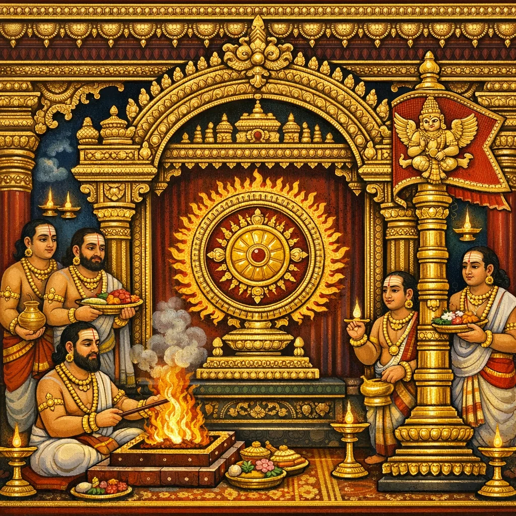 يُصاغ (الشعار المقدّس) على هيئة عجلة ذات ثمانية أضلاع أو اثني عشر ضلعًا، وفي الوسط صورةٌ مُجسَّدة؛ ويجوز أن تُقرَن بنارَسِمْهَ (Narasiṃha) وبِتاركشْيَة (Tārkṣya/غارودا). ويجب أن تكون سارية الراية (dhvaja-daṇḍa) خالية من الجروح والعيوب.