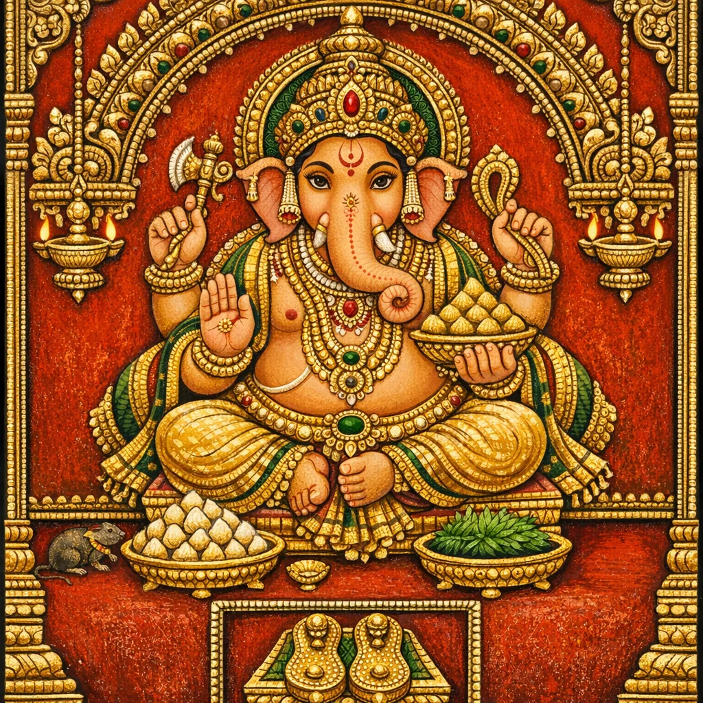 ذو وجه الفيل، عظيم البطن، (كشيرفي) المهيب، مُزيل العوائق، ذو لونٍ كالدخان—هذه وغيرها ابتداءً من مهايندرا تُذكَر بوصفها أسماءً/هيئاتٍ جليلة للرب غَنَپَتي، جديرةً بالعبادة.