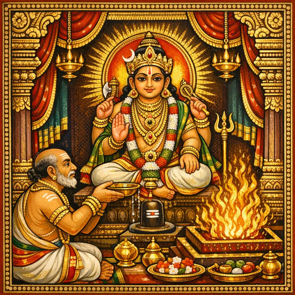 المأكولات التي تُلعَق وتُمتَصّ وسائر الأطعمة، مع القربان اللاحق (anuvara)، والتامبولا (البتل)، والأكاليل والأدهان العطرية، والنِرمالْيَا (البقايا المُقدَّسة)، والطعام—كل ذلك مُعطًى لك بأمر شِڤا Śiva.