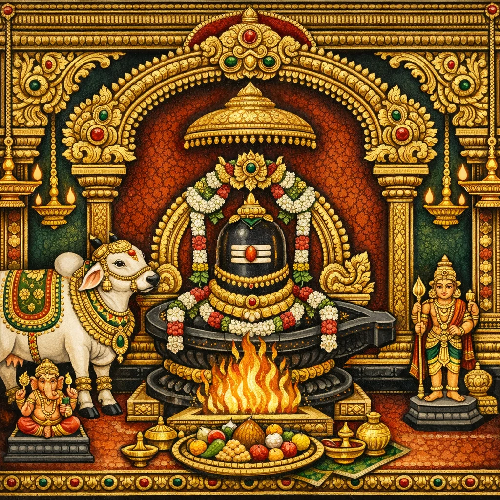 متأمّلًا: «أنتَ نارُ شِيفا المباركة»، يضع (القربان أو التقدمة المُفعَّلة) في نار الموقد المنزلي (cullikā-agni). (ثم يُتلى:) «أوم hāṃ—نَمَسٌ حقًّا لأغني؛ hāṃ—نَمَسٌ حقًّا لسوما».