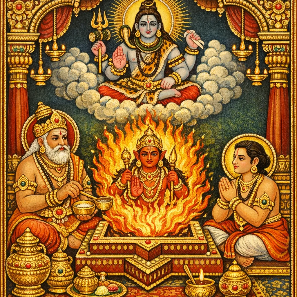 وبعد أن يضع القرابين في الأوعية وهو يتلو المانترا المقرونة بالختام «svāhā»، ثم—كما سُبق بيانه—يُقَدِّم السمنَ المذاب المُعَدَّ في النار قربانًا، ينبغي أن يقدّمه إلى Sthaṇḍileśa، ربّ المذبح.