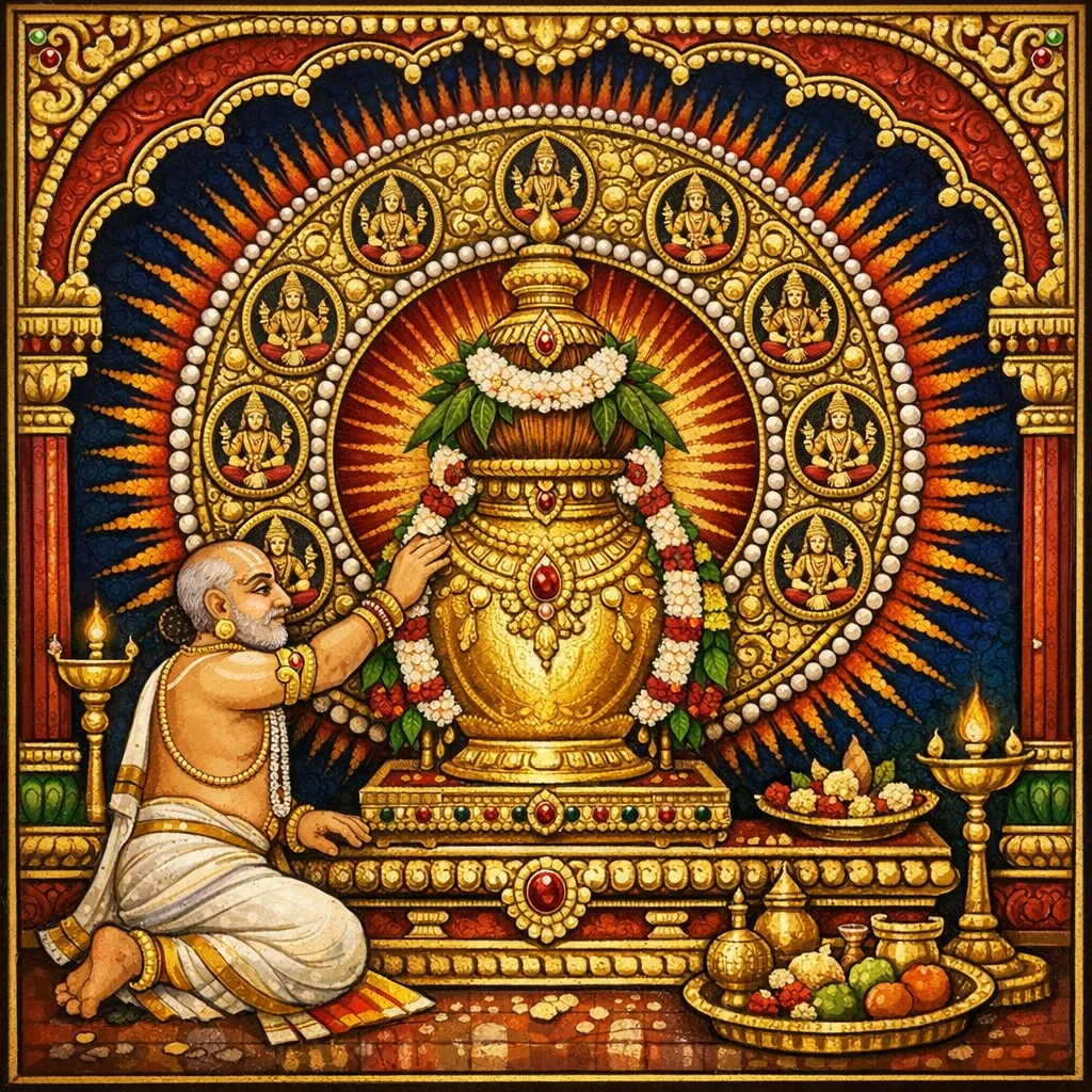 The pratiṣṭhā-kalaśa (consecration water-pot) and the ritual field around it, through tattva-śuddhi, mantra-phonology (nāda/anāda), mudrā, homa, and bond-removal (pāśa-viyoga) procedures.