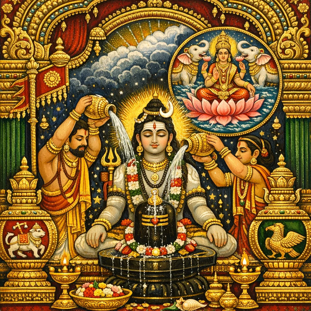 بتلاوة المانترا: «أوم هْرِيم، يا شانكري، املئي (هذا)؛ سْفَاهَا»، ينبغي للممارس العارف أن يجري النْياسا (nyāsa)—أي وضع (المانترا/الطاقة)—أولًا على الـpiṇḍikā (قاعدة المِصطبة)، ثم على اللِّينغا، مُثبِّتًا مبدأ «كِرِيَا» (الفعّال/الطقسي) في صورة الـpīṭha الأيقونية.