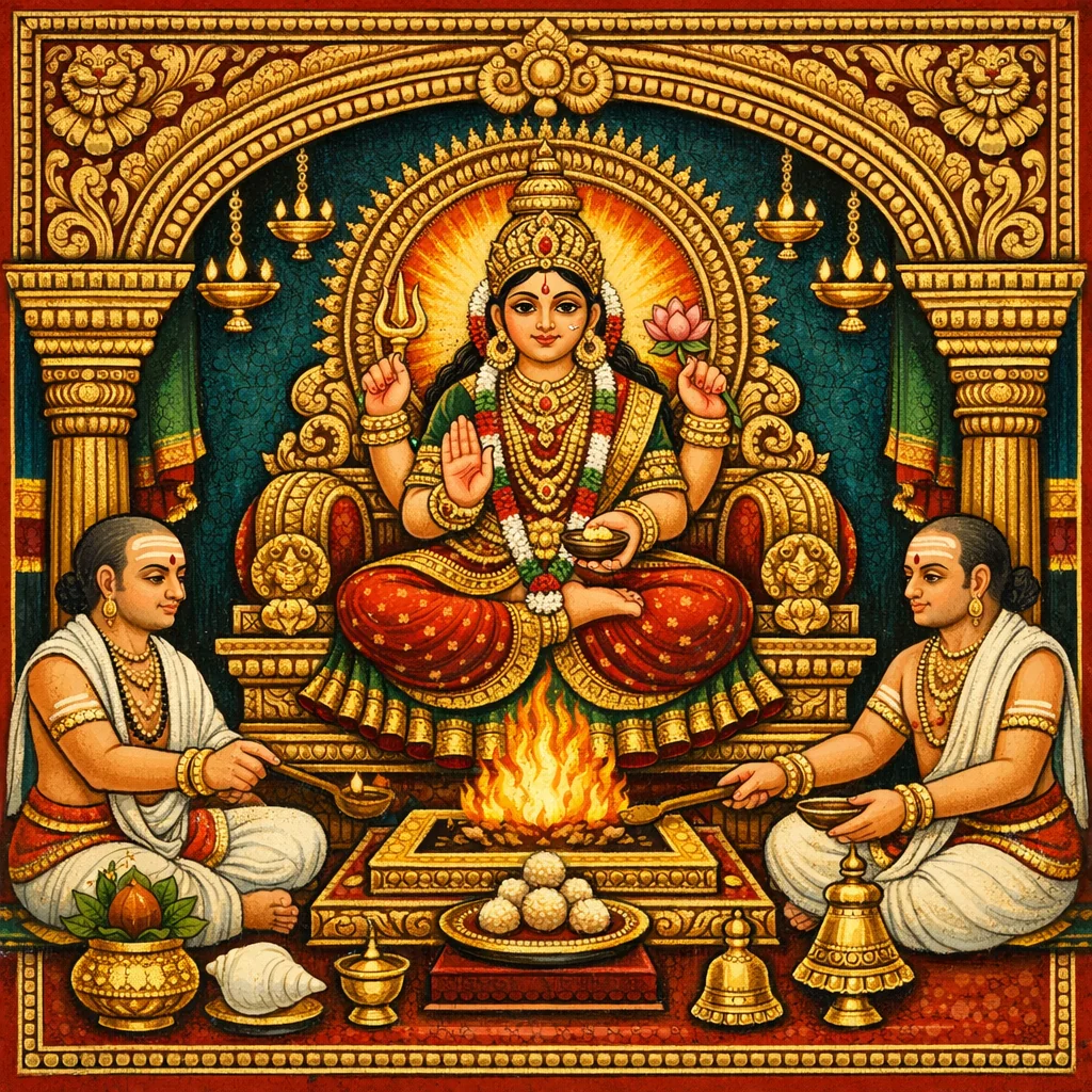 بعد التأمل في (الإلهة) على أنها سارية في جميع الناحية، وكذلك بعد تصورها/إيداعها مع الجواهر وسائر القرابين الموضوعة على الوجه اللائق؛ فإذا أُقيمت على هذا النحو، فليُستدعَ الإلهة ثم تُعيَّن وتُثبَّت في ذلك (الصورة/المقعد/موضع الشعيرة).