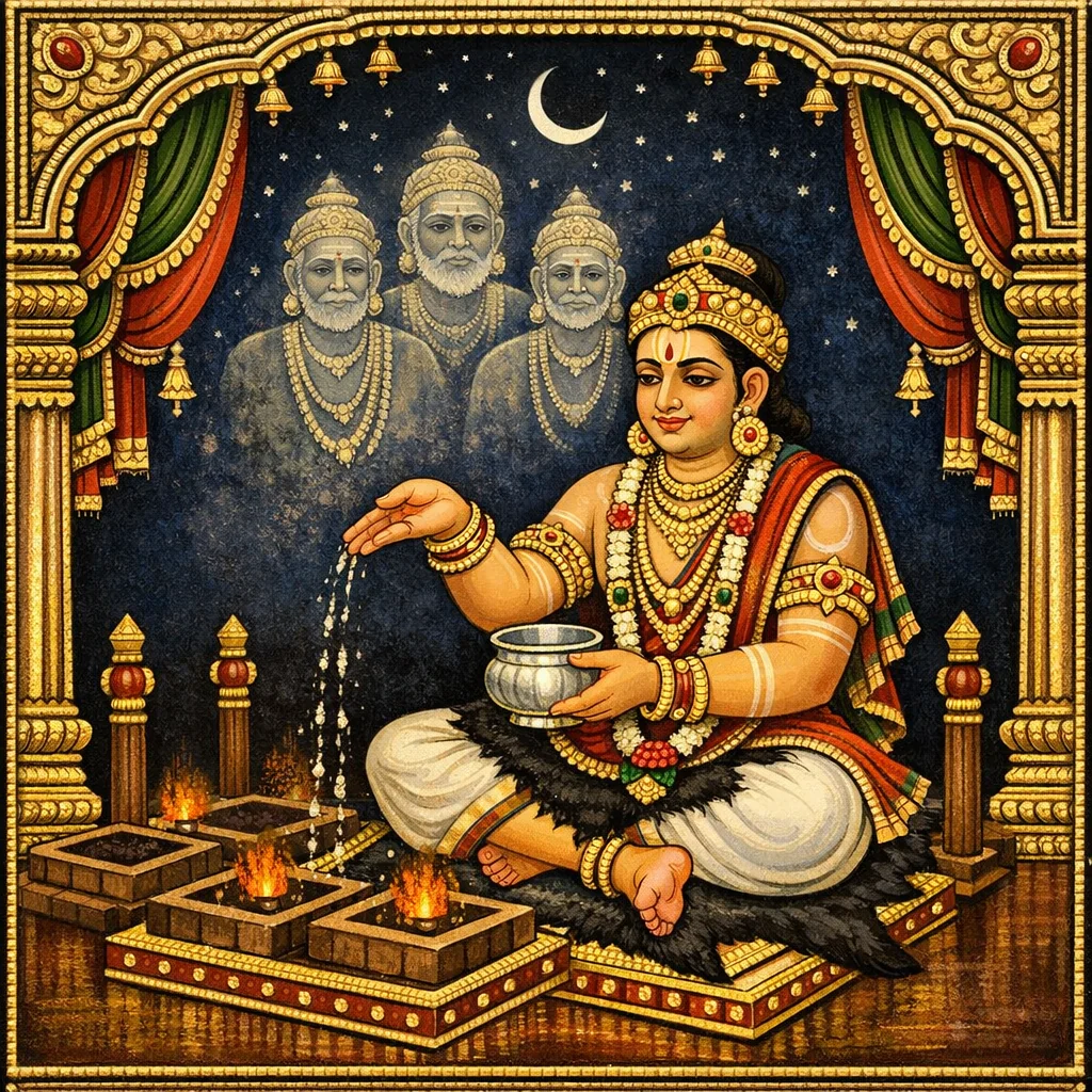وأُقدّم النمسكار لقادة المانو وغيرهم، وكذلك لقادة الشمس والقمر؛ وبعد أن أحيّيهم جميعًا أعمل أيضًا بالشرائع والطقوس الخاصة بالپِتْرِ.