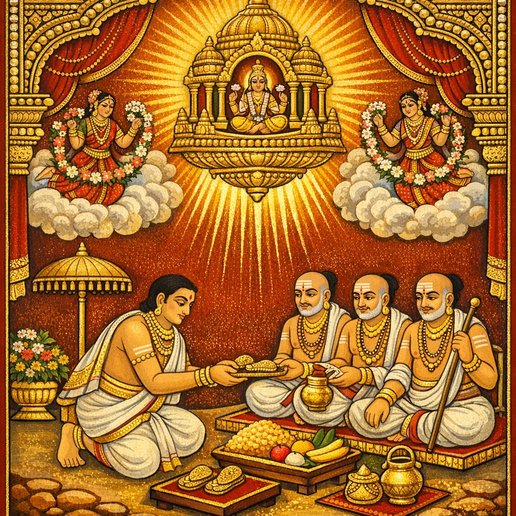 من قدّم أنواعًا شتى من المأكولات نال السرور في الدنيا والآخرة؛ وأقراص پṛthukā الممزوجة بالسكر واللبن تمنح ثوابًا دائمًا غير منقوص.