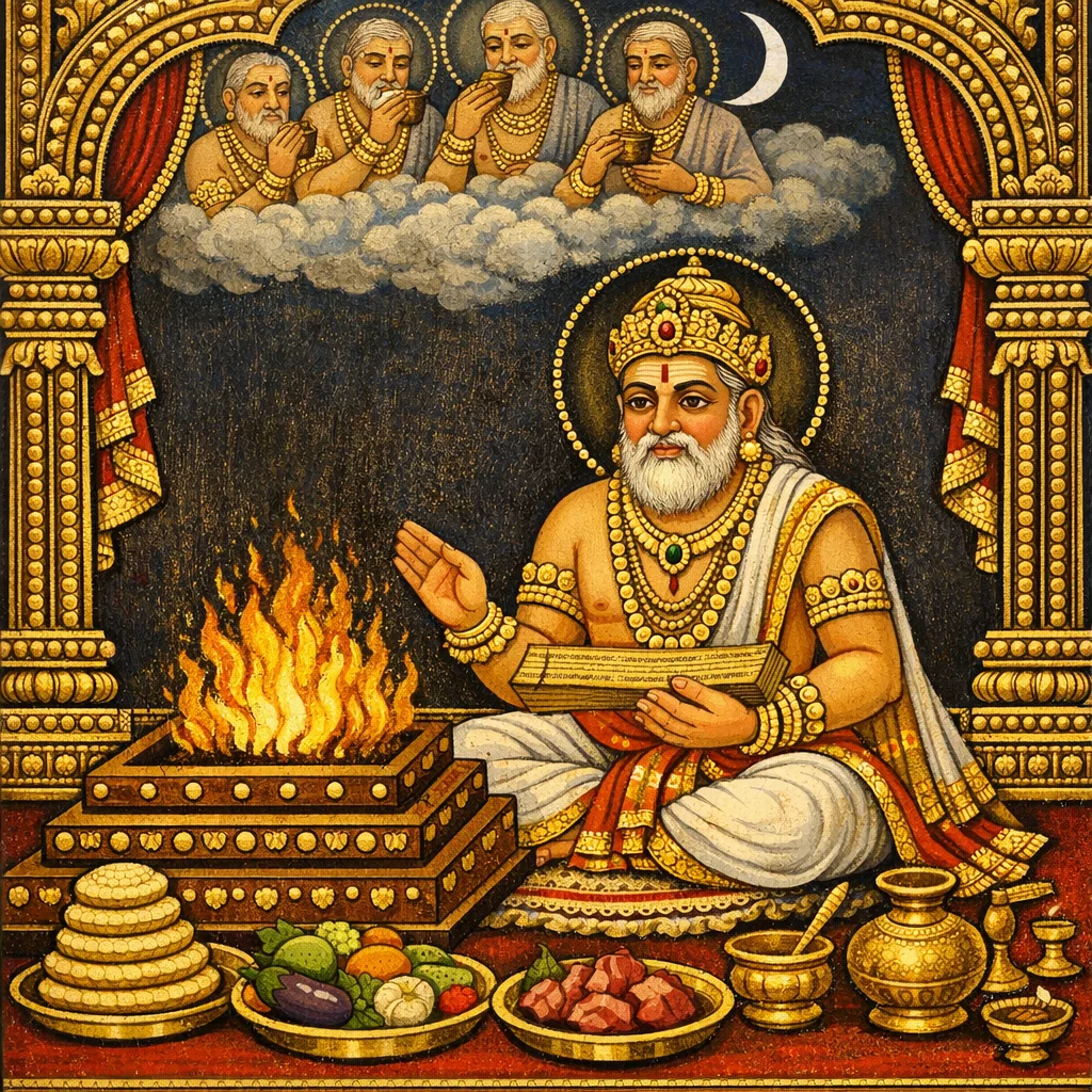 Rite (Kalpa): it is a śrāddha-focused chapter (Śrāddha-kalpa) that systematizes Aṣṭakā observances and dāna as the merit mechanism that indirectly supports lineage continuity rather than listing dynastic genealogies.