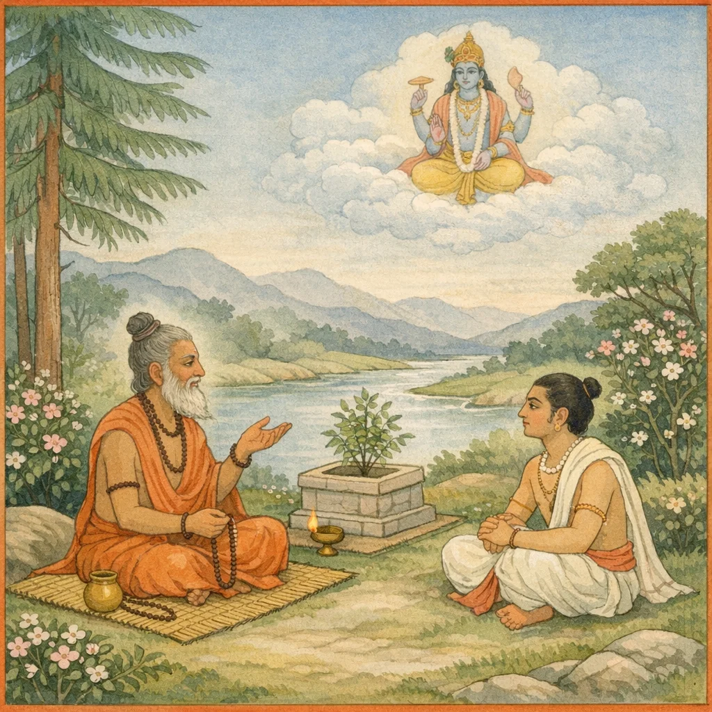 «لقد سُرِرتُ بتقشّفك هذا؛ فاختر نعمةً بهيّة.» فلمّا رأى هْرِشِيكِيشا، ربّ الحواس، راضيًا، وشاهد ذلك الربّ، قرين كَمَلا (لاكشمي)…