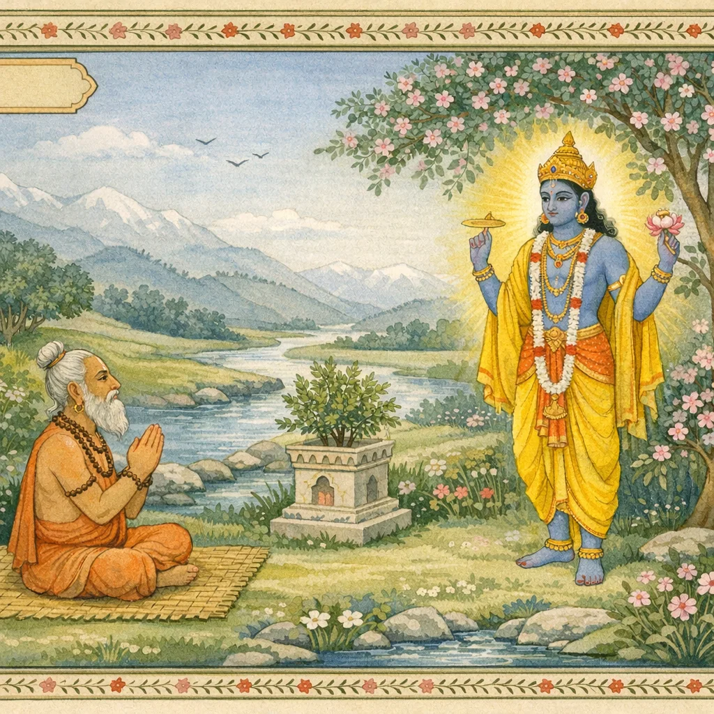 فلما قيل ذلك، ابتسم ذلك الناسك وقال: «نعم، أنا—فيشنو—قد جئتُ إلى هنا لأتعرّف على دارماكم.»