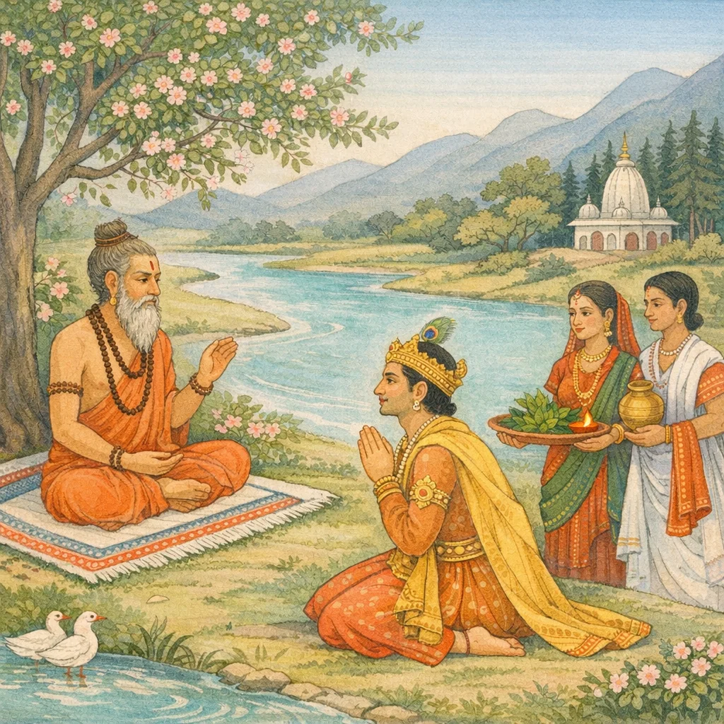 يروي هذا الفصل عودة كṛṣṇa إلى دڤارَكا (Dvārakā) وإقامة زواج رُكْمِنِي (Rukmiṇī) وفق السنن الفيدية. وتظهر علامات سماوية—طبول إلهية وابلٌ من الزهور—تؤكد بركة هذا الاقتران ويمناه على مستوى الكون. يجتمع أعلام اليادافا (Yādava) مثل بالابهَدرا (Balabhadra) وفاسوديفا (Vasudeva) وأوغراسينا (Ugrasena) وأكرورا (Akrūra)، كما يحضر شيوخ فْرَجا (Vraja): ناندا ويشودا مع الغوبا والنساء. ويتولى البراهمة (brāhmaṇa) إقامة الشعائر وتقديم البركات، وتبرز الهدايا والضيافة وإكرام الضيوف مثالًا للملكوت الموافق للدارما (dharma) ولأخلاق البيت. تُختَتم المراسم بتعظيم جاتافيداس (Jātavedas، النار المقدسة) والسجود للأكابر وللبراهمة، ثم توديع الملوك والكهنة الزائرين على نظام. وبعد ذلك يقيم كṛṣṇa ورُكْمِنِي في راحة بقصرٍ سماوي، كأنهما نارايانا (Nārāyaṇa) مع شري (Śrī)، يثني عليهما الحكماء والآلهة.