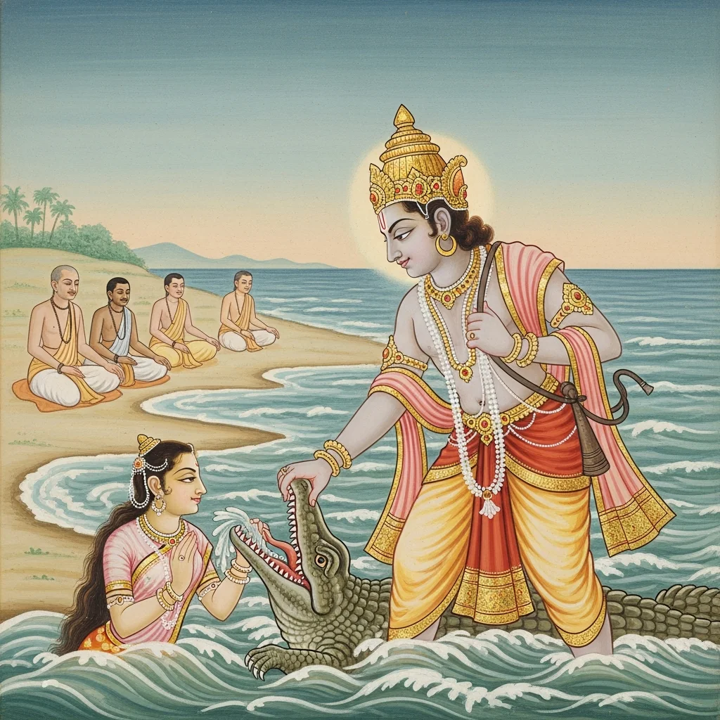 Pañca-Tīrtha Prabhāva and the Grāha-Śāpa Liberation (पञ्चतीर्थप्रभावः ग्राहशापमोचनं च)