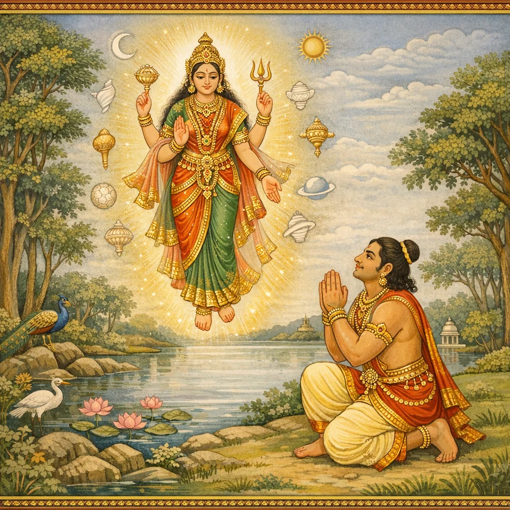 يروي سوتا أنّ يودهيشثيرا، بعد إقامة سبع ليالٍ في التيرثا، تهيّأ للرحيل: تطهّر صباحًا، وعبد الإلهات واللينغا، وطاف حول الكشيترا، وتلا ترنيمة الوداع. ثم قدّم صلاة لجوءٍ (شَرَناغَتي) متمحورة حول الديفي، مناديًا إيّاها «مهاشاكتي» وبوصفها «إيكانَمْشا» أخت كريشنا المحبوبة، مؤكّدًا صورتها الكونية الشاملة وملتمسًا حمايتها. وردّ بهيما (ابن فايُو) بانتقادٍ جدليّ صيغ كتحذيرٍ أخلاقي من اللجوء في غير موضعه ومن «الكلام العاطل»، زاعمًا أنّ العالِم لا ينبغي أن يستجير بـ«بركريتي» (المصوَّرة كمُضلِّلة)، بل أن يمدح مهاديڤا وفاسوديفا وأرجونا وبهيمـا نفسه؛ كما دان الحديث العقيم بوصفه مؤذيًا روحيًا. فأجابه يودهيشثيرا مدافعًا عن الديفي بوصفها أمّ الكائنات، المعبودة لدى براهما وفيشنو وشيفا، ووبّخ بهيما على الاستخفاف. وفورًا فقد بهيما بصره، ففُسِّر ذلك بسخط الديفي؛ فاستسلم تسليمًا كاملًا وتلا ستوترا مطوّلة تُعدِّد هويّات الديفي (براهمي، فايشنفي، شامبهافي؛ شاكتيات الجهات؛ الارتباطات الكوكبية؛ شمولها للكون والعوالم السفلى)، وتضرّع لعودة عينيه/بصره. فظهرت الديفي في تجلٍّ مشرق، وواست بهيما، وأمرته أن يكفّ عن ازدراء أهل العبادة، وكشفت دورها الخلاصي بوصفها عونًا لفيشنو في إعادة إقامة الدارما. ثم أعلنت ميثاقًا نبوئيًا لمواضع التيرثا ومزارات الديفي في كالي-يوغا: سمّت أماكن مستقبلية (لوهانا ولوهانا-بورا؛ دهارمارانيا قرب ماهيساغارا؛ أَتّالَجا؛ غايا-ترادا)، وعبّادًا قادمين (كيلو، فايلَاكا، فاتسا-راجا)، ومواقيت شعائرية (مثل شوكلا سبتَمي وشوكلا نَفَمي وتِثي أخرى)، وما وُعِد به من ثمرات (قضاء الحوائج، الذرية، الجنة، التحرّر، إزالة العوائق، والشفاء بما فيه شفاء البصر). ويُختَم الفصل بدهشة الباندافا ومواصلة حجّهم، بما في ذلك تنصيب برباريكا والانطلاق إلى تيرثات أخرى.