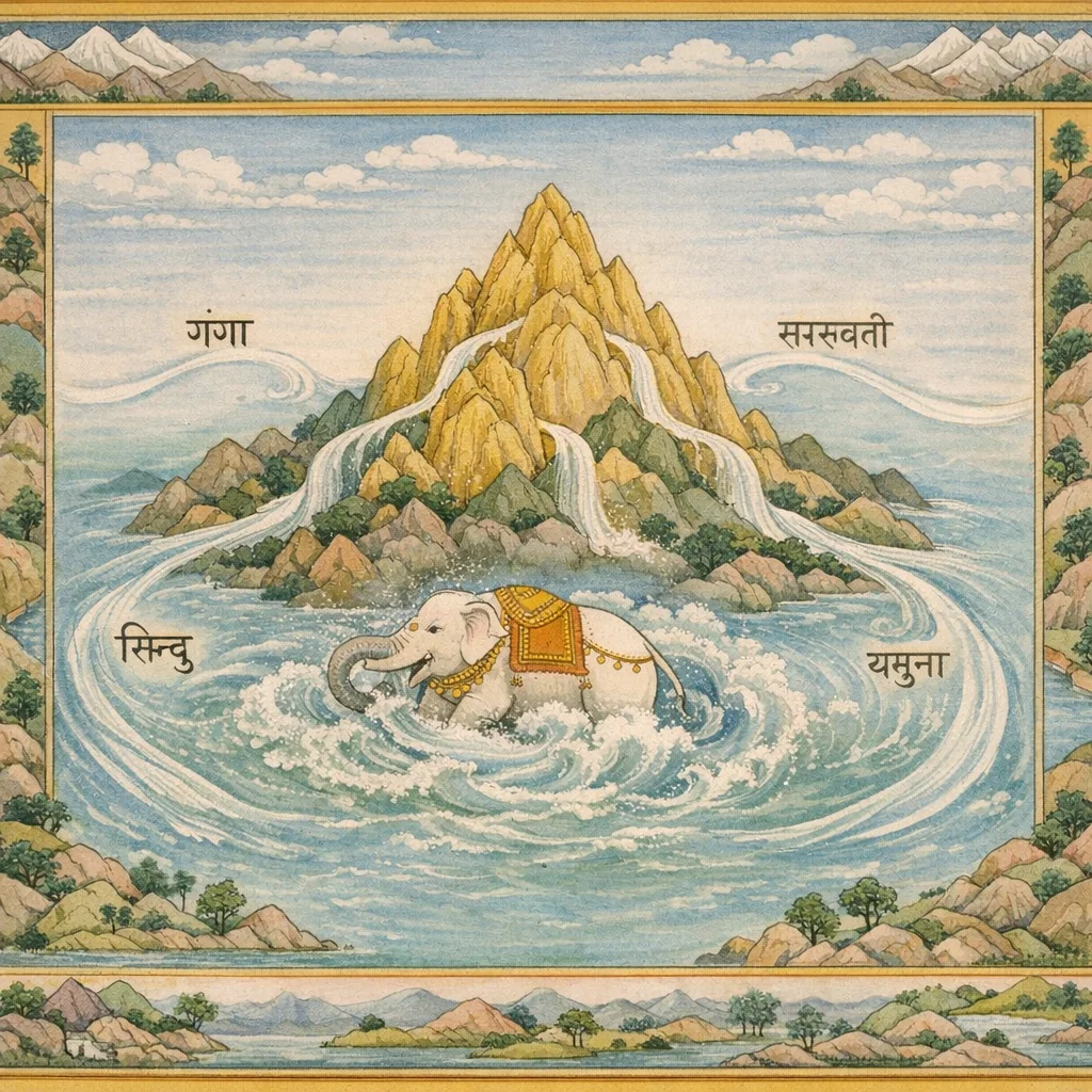 يمتدّ ستين ألف يوجانا؛ بلا سندٍ يهبطُ نازلاً، ويسيرُ في مسارٍ يمينيّ (مع عقارب الساعة)، ثم مضى منقسماً إلى أربعة مجارٍ.