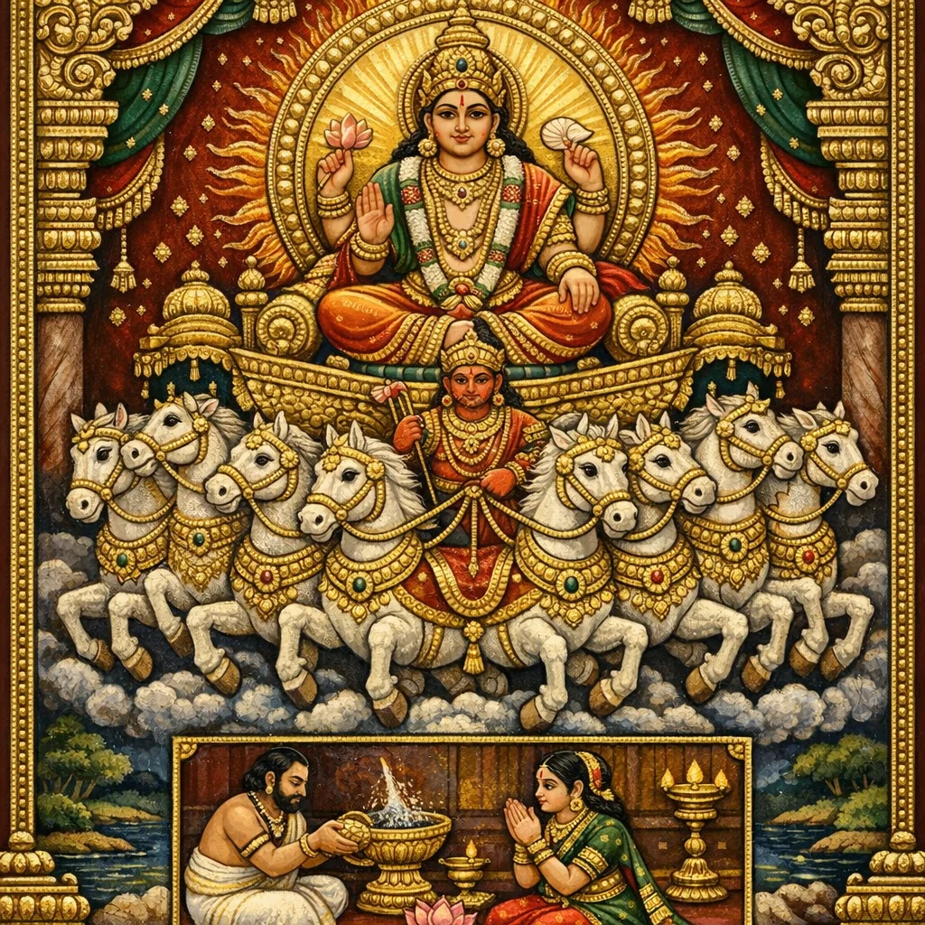 Sūrya symbolizes regulated time, vitality, and clarity; Sun-worship frames the practitioner’s discipline before entering specialized mantra and homa procedures.