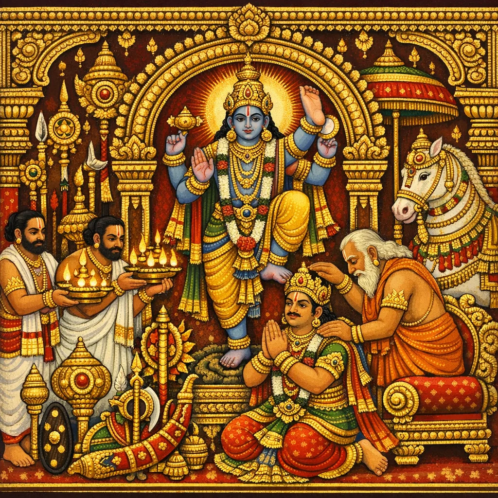 রাজ্য লাভ করে রাজা দেবেশ ও দেশপালদের রক্ষা করবে। সে দেবতাদের পূজা করবে এবং এখানে তাদের বিধিসিদ্ধ আয়/অধিকার হ্রাস করবে না।