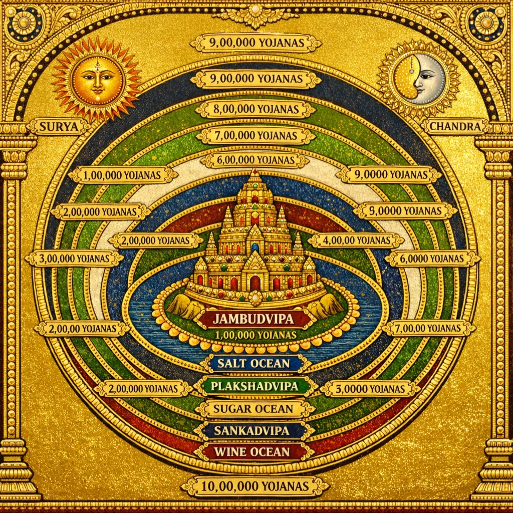 A cosmographic-measurement passage: it correlates sun and moon discs (maṇḍalas), their radiance and motion, and the quantified layout of the earth-system (sapta-dvīpa and sapta-samudra) using yojana-based metrology anchored around Meru.