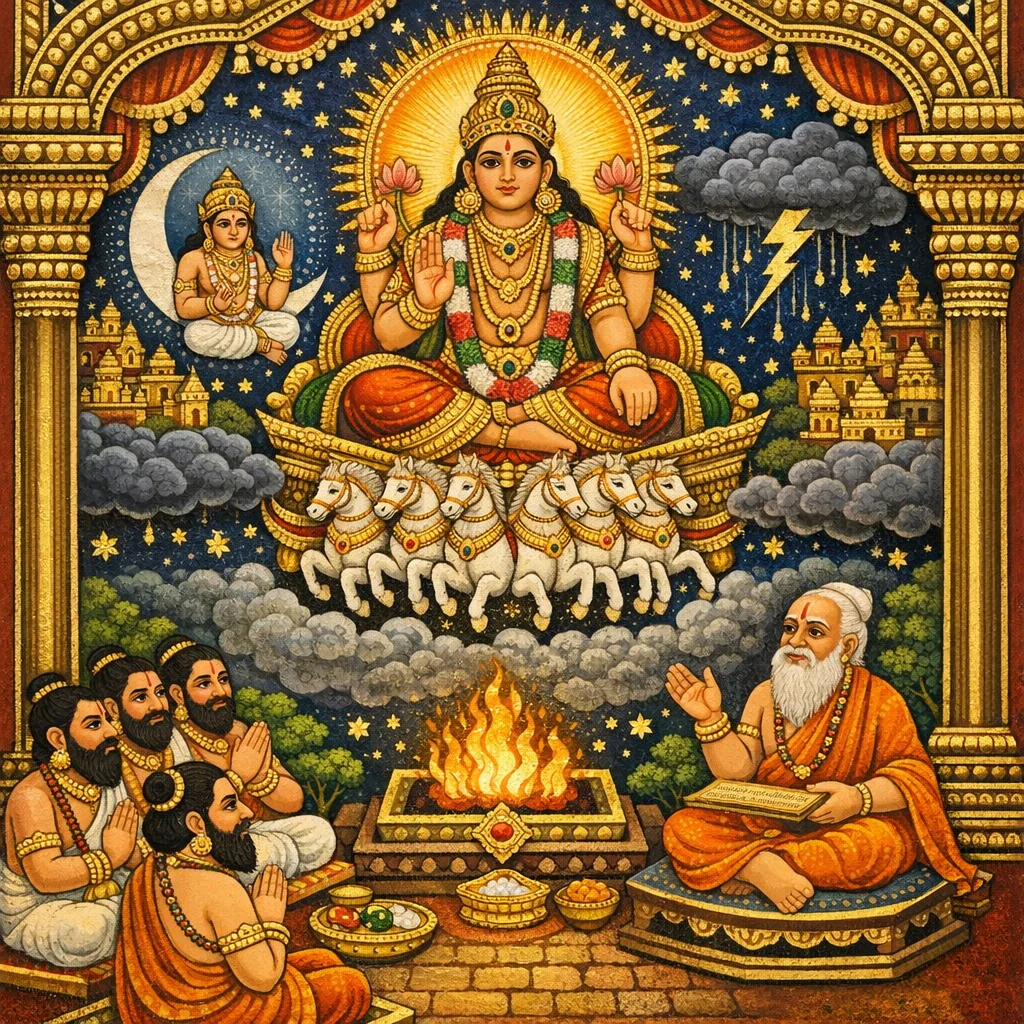 বসন্ত ও গ্রীষ্মে তিনি তিন শত রশ্মিতে তাপ দেন; আর বর্ষা ও শরতে চার শত রশ্মিতে বৃষ্টি বর্ষণ করেন।