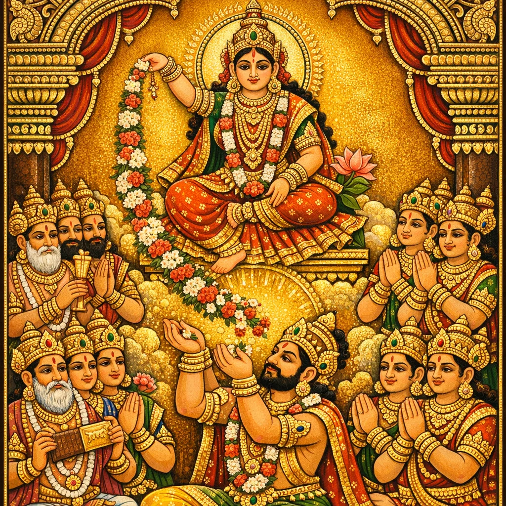 স্বয়ং লক্ষ্মীপতি সাম্রাজ্যের সূচক ছত্র প্রদান করলেন; আর গঙ্গা ও যমুনা তাঁদের চন্দ্রপ্রভায় দীপ্ত চামর দিলেন।
