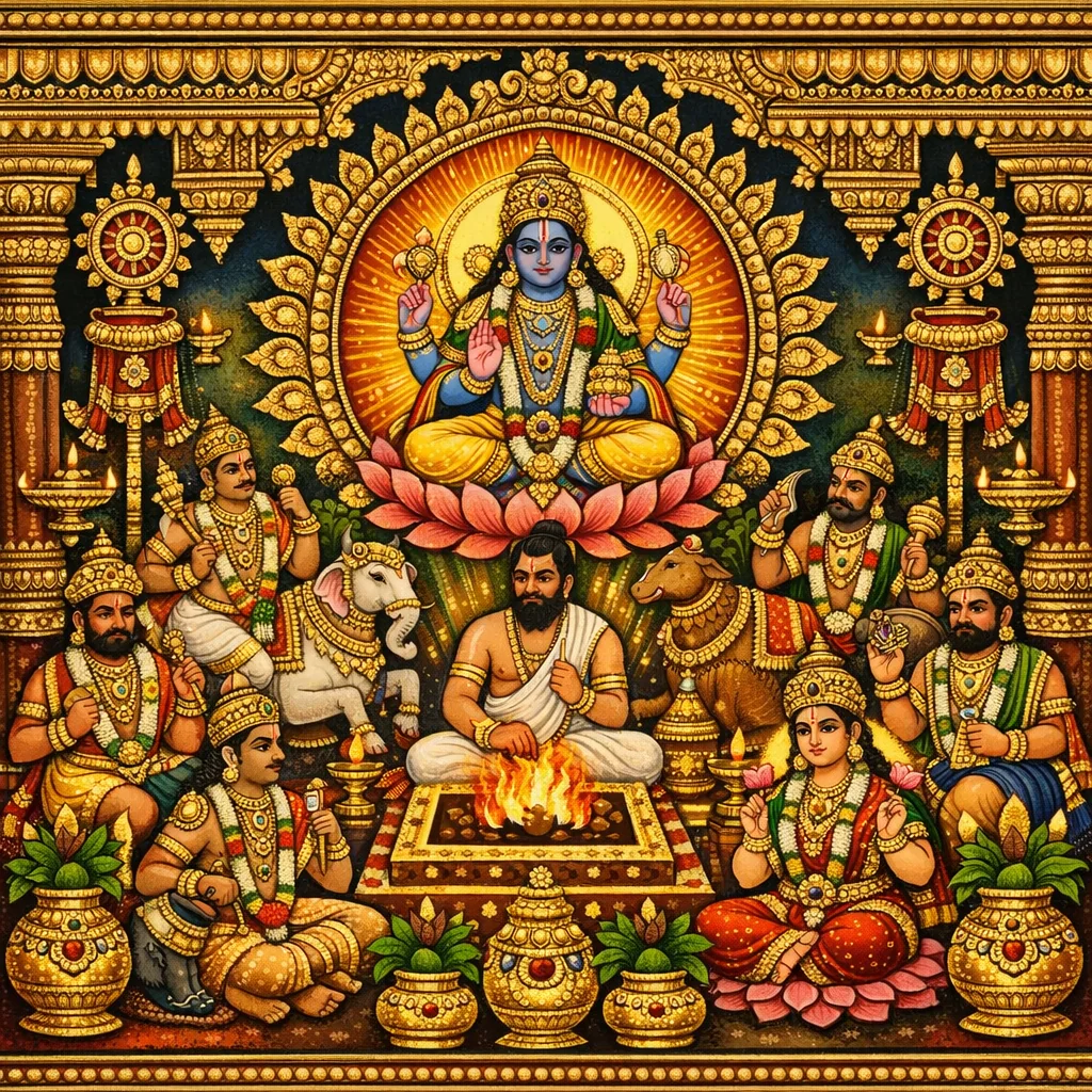Bhagavān erläutert das pratiṣṭhā-pañcaka, indem er Bildgestalt, Sockelbasis und Weihe in eine metaphysische Trias einordnet: Die pratimā wird durch Puruṣa beseelt, die piṇḍikā entspricht Prakṛti, und Lakṣmī bezeichnet den stabilisierenden Akt der pratiṣṭhā; ihre Vereinigung heißt yogaka. Das Ritual beginnt zur Erlangung des gewünschten Ergebnisses (iṣṭa-phala) und schreitet mit räumlich-architektonischen Vorbereitungen fort: Ziehen der garbha-sūtra-Achse, Einteilung und Vermessung des maṇḍapa, Anordnung der snāna- und kalaśa-Funktionen sowie Bereitung der yāga-dravya. Der Altar (vedī) wird nach Proportionen (ein Drittel/eine Hälfte) bemessen, mit kalaśa, ghaṭikā und Baldachinen geschmückt; alle Materialien werden mit pañcagavya gereinigt. Der Guru weiht sich selbst durch Meditation auf Viṣṇu und Verehrung des eigenen Selbst als rituellen Ort; zugleich werden geeignete mūrtipā an jedem kuṇḍa eingesetzt. Tore (toraṇa) und Pfosten erhalten je nach Himmelsrichtung bestimmte Hölzer; die Anlage umfasst Mantra-Verehrung („syonā pṛthvī“), Sprossen an den Säulenbasen, das Sudarśana-Emblem, Banner-Vorschriften und eine weitreichende Platzierung von kalaśa. Schließlich werden die dikpāla in Gefäße gerufen und der Reihe nach verehrt—Indra (Osten), Agni (Südosten), Yama (Süden), Nairṛta, Varuṇa (Westen), Vāyu (Nordwesten), Soma/Kubera (Norden), Īśāna (Nordosten), Brahman für den Zenit und Ananta für den Nadir—damit sie Tor und Viertel schützen und den Ritualraum als bewachte kosmische Maṇḍala versiegeln.