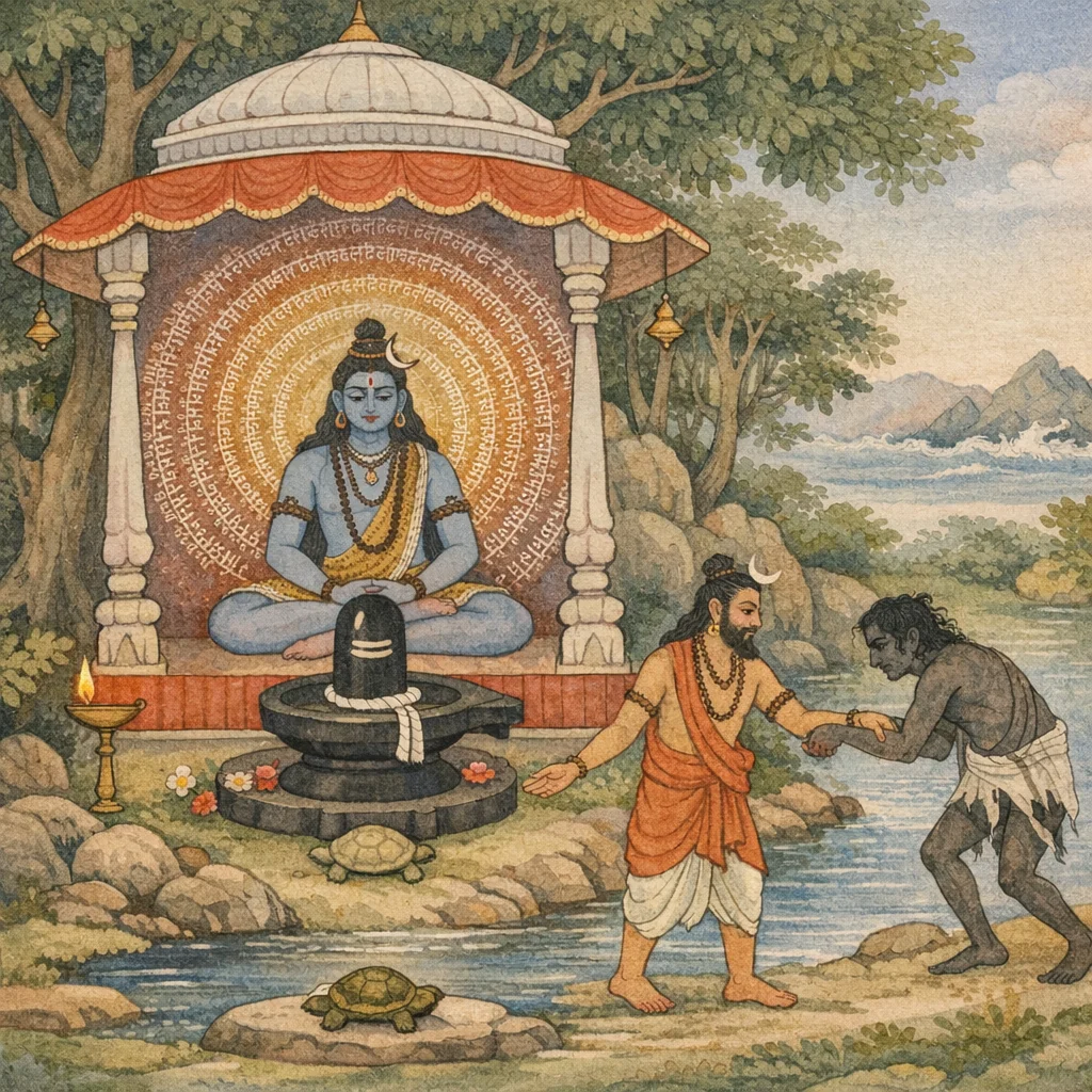 In diesem heiligen Gebiet lebte einst ein brahmanischer Asket, berühmt für seine treu bewahrten Gelübde, bekannt als Śaṅkukarṇa; er verehrte Śaṅkara. Unablässig wiederholte er das Mantra Rudras—den Pranava (Oṃ), die Gestalt Brahmans selbst.