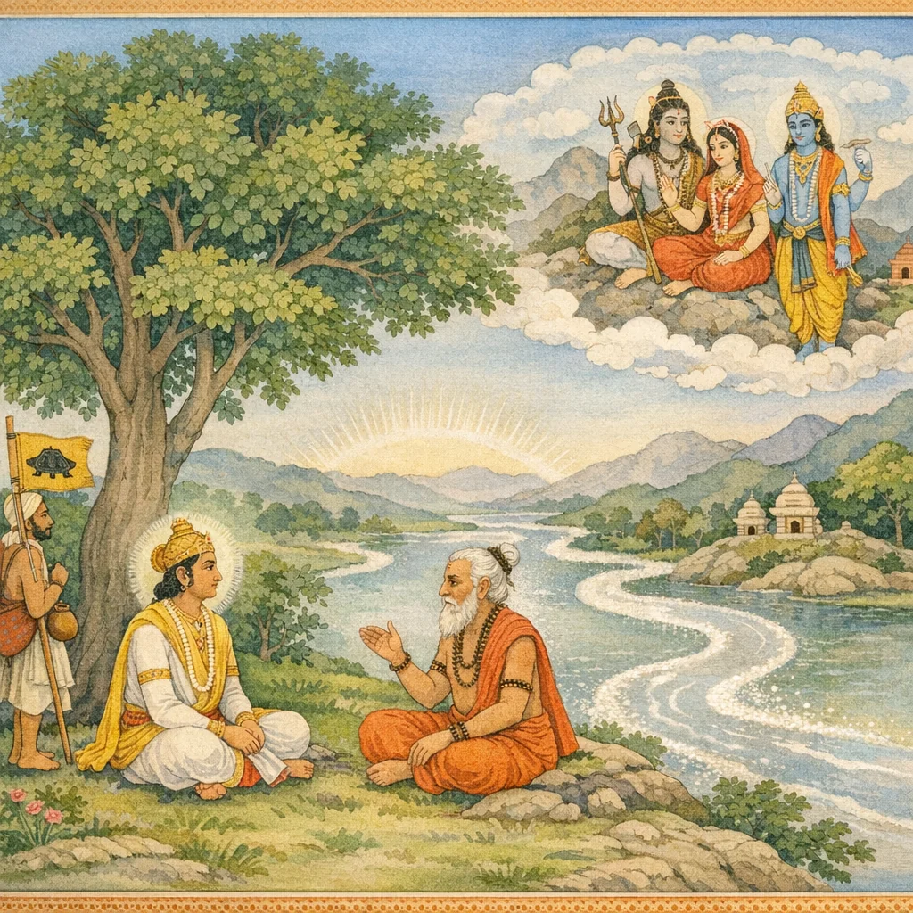 Am südlichen Ufer der Narmadā befindet sich ein großer Fluss namens Kapilā; nicht weit entfernt liegt er im Schatten von Hainen aus Sarala- und Arjuna-Bäumen.