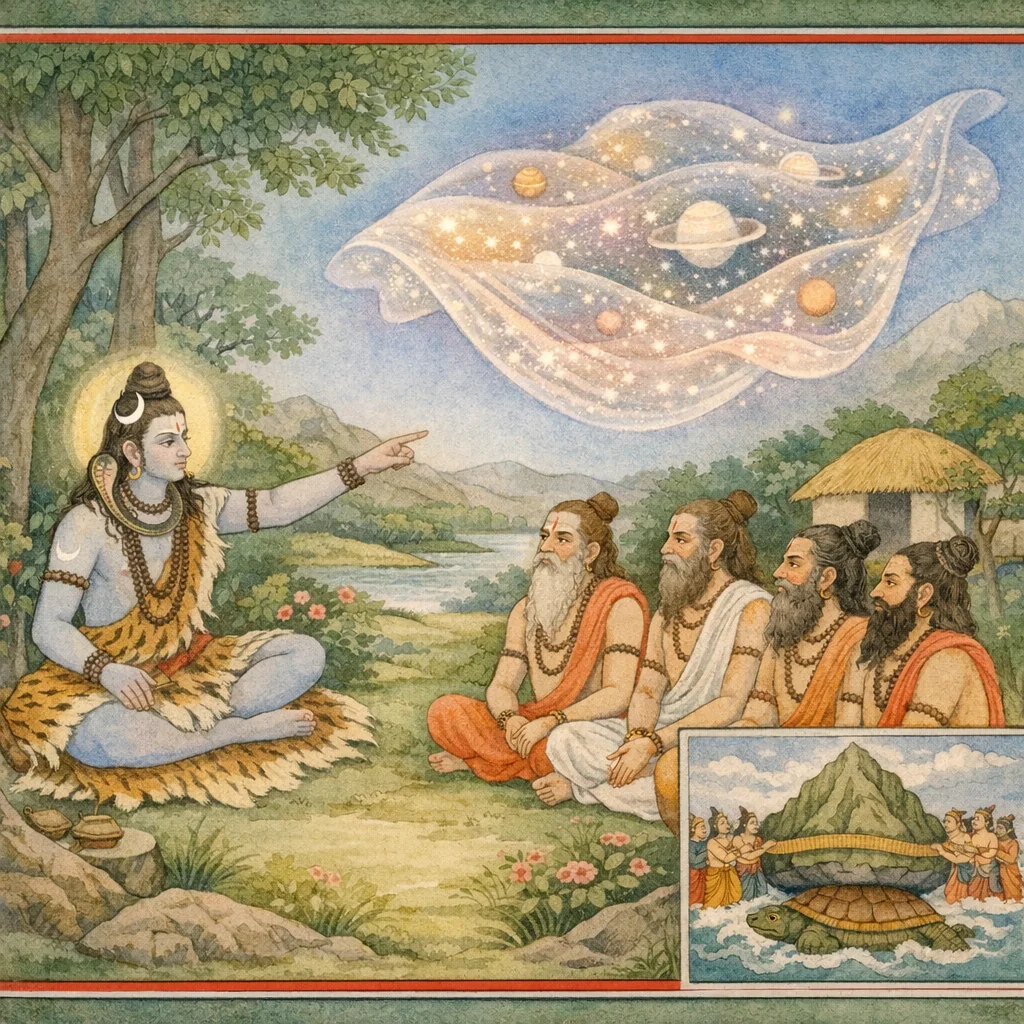 Die Weisen sprachen: „Der höchste Herr ist teil-los, makellos, ewig und ohne Handeln. Sage uns, o Mahādeva: Wie kommt es, dass du zugleich Viśvarūpa bist, dessen Gestalt das ganze Universum ist?“