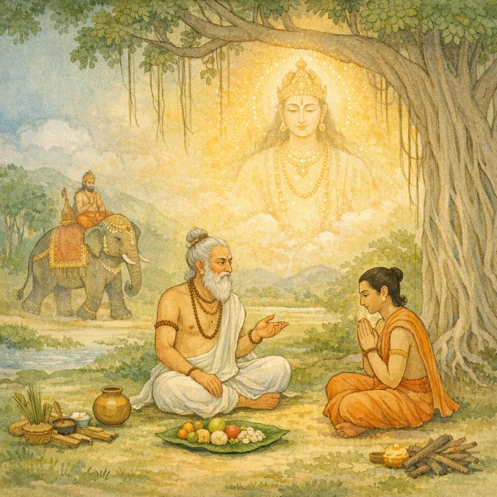 दूरस्थितं महाभागे जनसंमर्दवर्जकम् । क्षुत्क्षामकण्ठमायांतमरण्यात्ससमित्कुशम् ॥ ७१ ॥