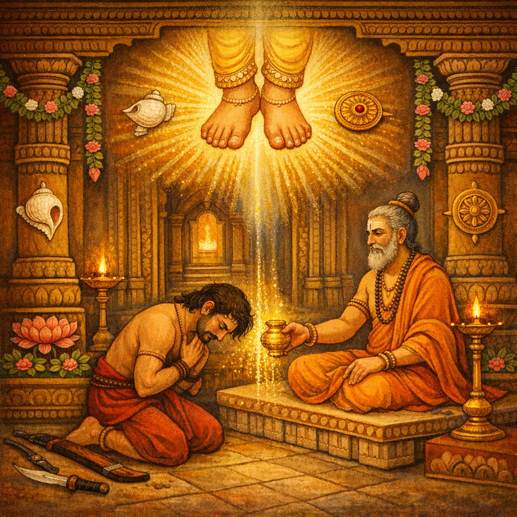 Als der großgesinnte Uttanka den gefallenen Jäger sah, von Mitgefühl bewegt, besprengte er ihn mit dem Wasser, das die Füße des Herrn Vishnu gewaschen hatte.