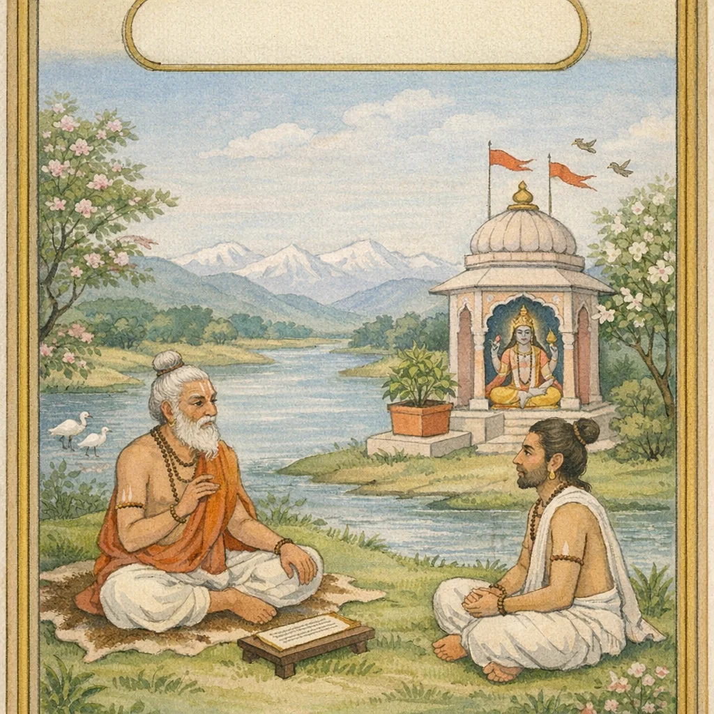 Śivaśarmā vertraut Somaśarmā einen Topf mit „amṛta“ (Nektar) an und zieht zu Pilgerfahrt und Askese fort. Später kehrt er zurück, um ihn durch māyā zu prüfen: Er erscheint als Aussätziger, von Leid gezeichnet, und zeigt erschütternde Gestalten, um seinen Mut zu brechen. Somaśarmā antwortet mit Mitgefühl und strenger guru-sevā: Er reinigt Unrat, trägt und entfernt die Unreinheiten, richtet das Bad an heiligen Tīrthas, Opfergaben und tägliche Ehrungen aus. Selbst wenn der Vater ihn hart schilt und sogar schlägt, bleibt er ohne Zorn und hält am Dienst fest. Als der Topf durch die Illusion leer zu sein scheint, beruft sich Somaśarmā auf satya und auf die Wahrheit seines Dienstes. Durch die Kraft der Wahrheit und des dharma füllt sich das Gefäß erneut und offenbart: Innere Lauterkeit und hingebungsvoller Dienst—unter Viṣṇus Gnade—überwinden Bedrängnis und stellen das Heilvolle wieder her.