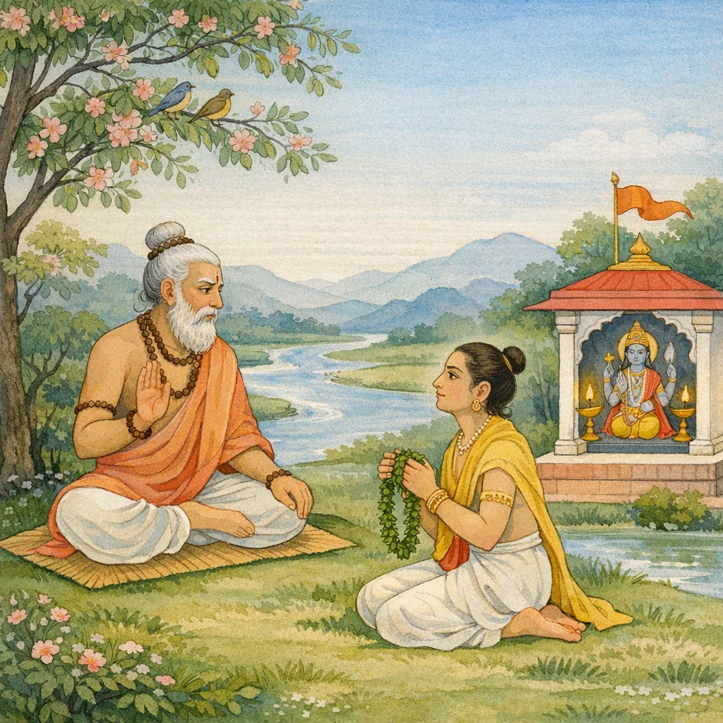 In PP.2.52 entfaltet sich eine Dharma-Gleichnisrede über Gastfreundschaft und die Folgen, einen würdigen Menschen zu missachten. Eine Frau erscheint als Bettlerin verkleidet und wird mit Bad, Gewändern, Speise und Schmuck geehrt; solche Bewirtung gilt als die höchste, wohlgefällige Tat. Dann wendet sich die Erzählung zur Beichte und zum karmischen Schrecken: Das leidende Wesen berichtet von früherer Unterlassung der Ehrfurcht—kein Füßewaschen, kein Dienst—, vom Tod in Gram, vom Ergriffenwerden durch Yamas Boten, von Höllenqualen und erniedrigenden Wiedergeburten in Tierleibern. Es fleht Königin Sudevā und die Devī um Rettung an. König Ikṣvāku wird als Viṣṇu erkannt, Sudevā als Śrī; ihr satī-dharma wird zu einer kosmischen tīrtha. Die Göttin gewährt den Verdienst eines Jahres; die Bittende wird in eine strahlende göttliche Gestalt verwandelt und steigt zum Himmel auf, Sudevās Gnade preisend.