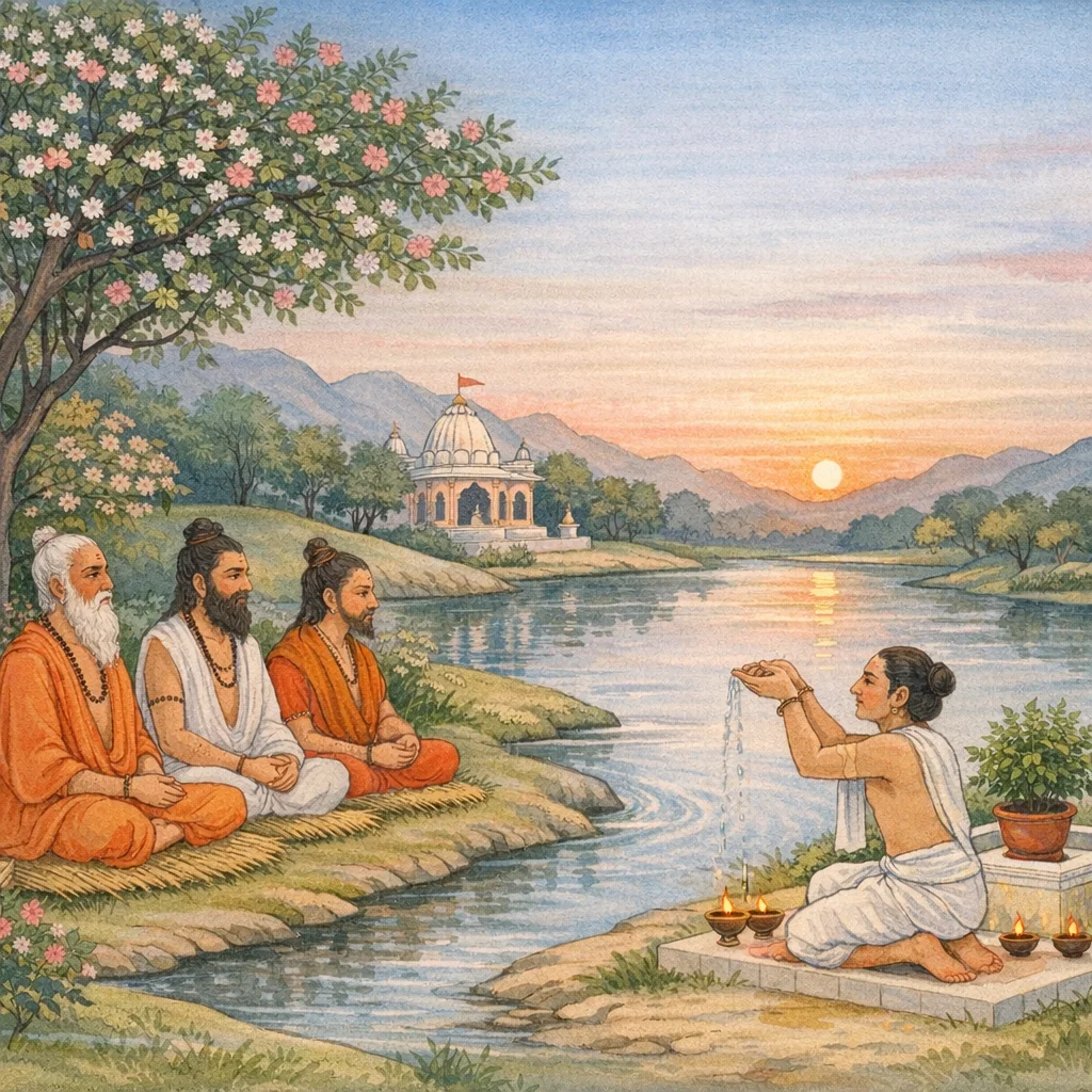 PP.5.15 schildert Sukanyās langes, asketisch geprägtes Dienen am greisen und erblindeten Weisen Cyavana und stellt es als Vorbild des strī-dharma dar: standhafte eheliche Treue, Reinheit und yogische Selbstzucht. Durch geduldige Pflege und innere Sammlung wird ihr häuslicher Dienst zur spirituellen Übung. Die Aśvinī-kumāras, göttliche Ärzte, erscheinen, werden geehrt und bieten eine Gabe an. Sukanyā erbittet das Augenlicht und das Wohlergehen ihres Gatten. Ein Opferfaden tritt hervor: Indem Cyavana zustimmt, ihnen einen Anteil am yajña zuzuweisen, wird ihr Anspruch legitimiert; als Erwiderung schenken sie verwandelnde Hilfe, die in Bilder der Verjüngung mündet. Darauf folgt die Szene der drei gleich schönen Männer, die Sukanyās Keuschheit und Unterscheidungskraft prüft. Am Ende zeigt sich göttlicher Wohlstand: Cyavana lässt ein wunscherfüllendes vimāna und eine juwelenhafte, prächtige Wohnstatt erscheinen und macht deutlich, wie tapas, dharma und Gnade sowohl zu bhoga (Genuss) als auch zu furchtloser, kummervoller Freiheit führen können.