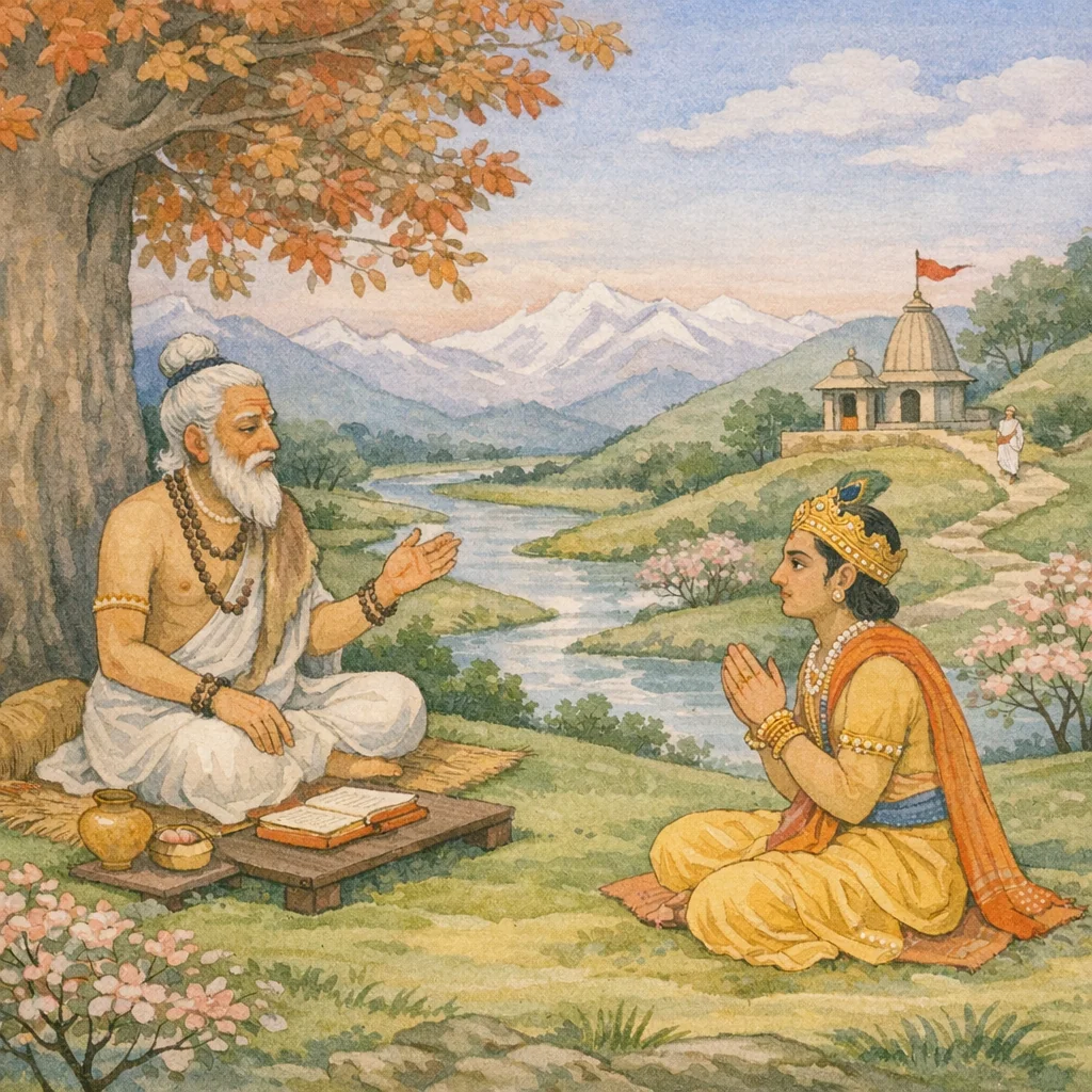 PP.5.99 schildert König Mahīratha als durch frühere Verdienste wohlhabend, doch durch zwanghafte Sinnlichkeit zugrunde gerichtet. Er überlässt die Regierung anderen, vernachlässigt das Dharma und verliert sich in Genüssen. Der Text betont die Verantwortung von Lehrer und König: Ein Guru, der den König nicht zügelt, hat Anteil an dessen Sünde; ein König, der den Rat missachtet, trägt die volle Schuld. Es folgt eine anhaltende Unterweisung in nīti und vairāgya über Vergänglichkeit, die Unzuverlässigkeit von Reichtum und Lust, die Notwendigkeit der Sinnesbeherrschung und die Vorrangstellung des Dharma als einzigem Gefährten im Tod. Um die erotische Verblendung zu brechen, werden eindringliche Bilder von Körperlichkeit und Unreinheit herangezogen und der Geist zur Entsagung gelenkt. Den Abschluss bildet ein heilbringendes Mittel: Der Monat Mādhava (Vaiśākha) und seine Observanzen—frühes Aufstehen, rituelles Bad und Verehrung Viṣṇus—werden als mächtig gepriesen, selbst große Sünden zu vernichten und den Verehrer in Haris Wohnstatt zu führen.