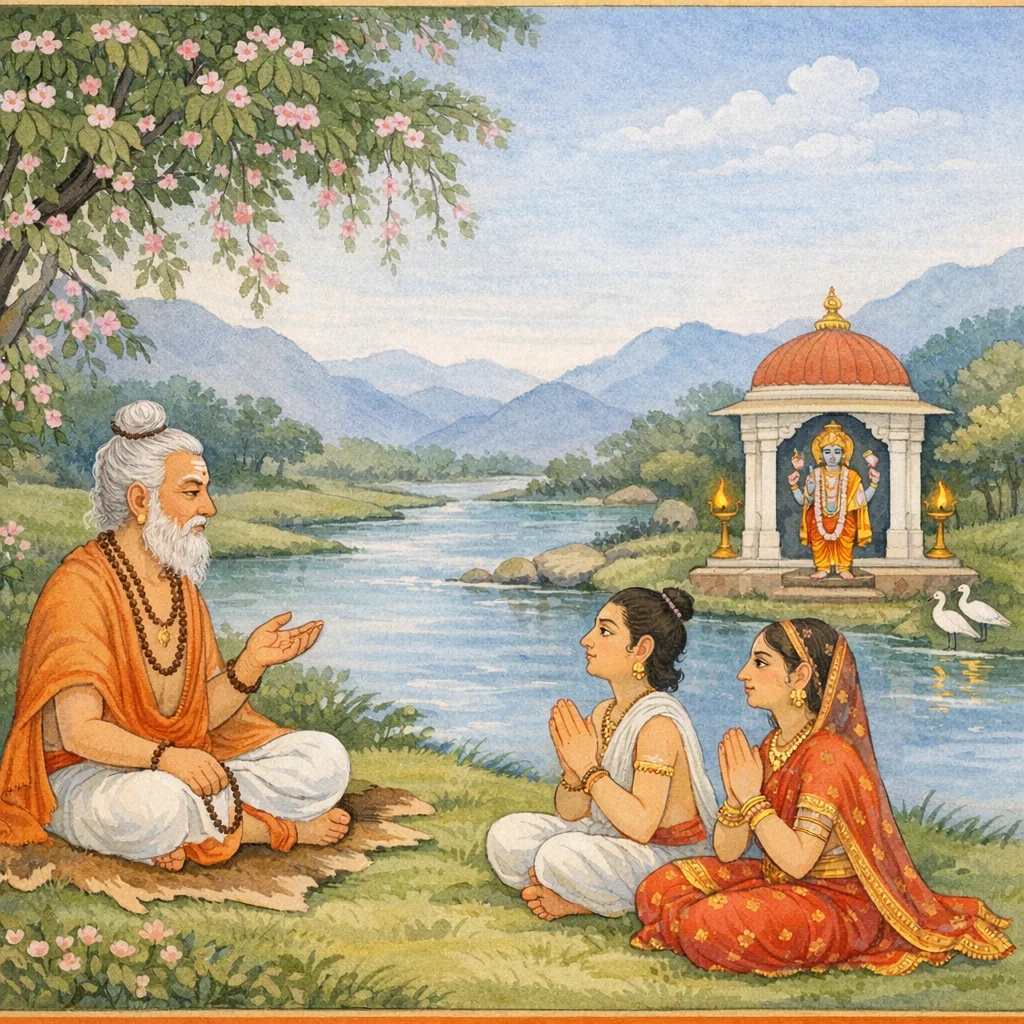 „Um den Ozean zu füllen, habt ihr euch mit Eifer dieser Mühe unterzogen.“ Als sie so die Worte des großen ṛṣi vernahmen, dessen Selbst gezügelt und in Betrachtung gefestigt war, …