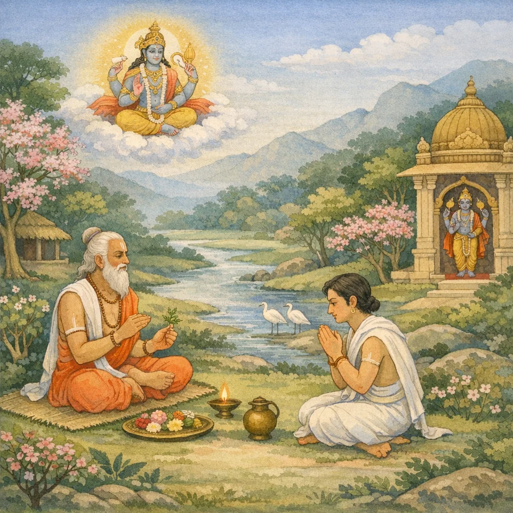 Pulastya sprach: So angesprochen, o König, brach Nārada nach Gandhamādana auf, um den erhabenen Weisen Nārāyaṇa im Āśrama von Badarī zu schauen.