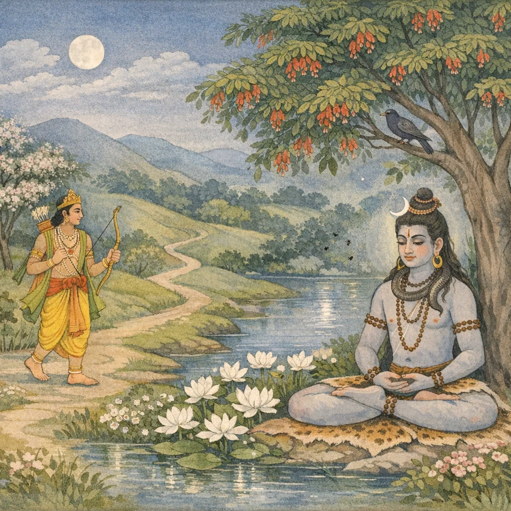 Als der Frühling sich dort ganz ausgebreitet hatte, spannte Kāma—von Ratī begleitet—seinen Pfeil aus Mangoblüte und stellte sich zu Seiner Linken, bereit, Verlangen zu entfachen. Doch für den Großen Herrn (Pati) sind solche Reize nur weltliche Kräfte, die das verwirklichte Selbst nicht binden können.