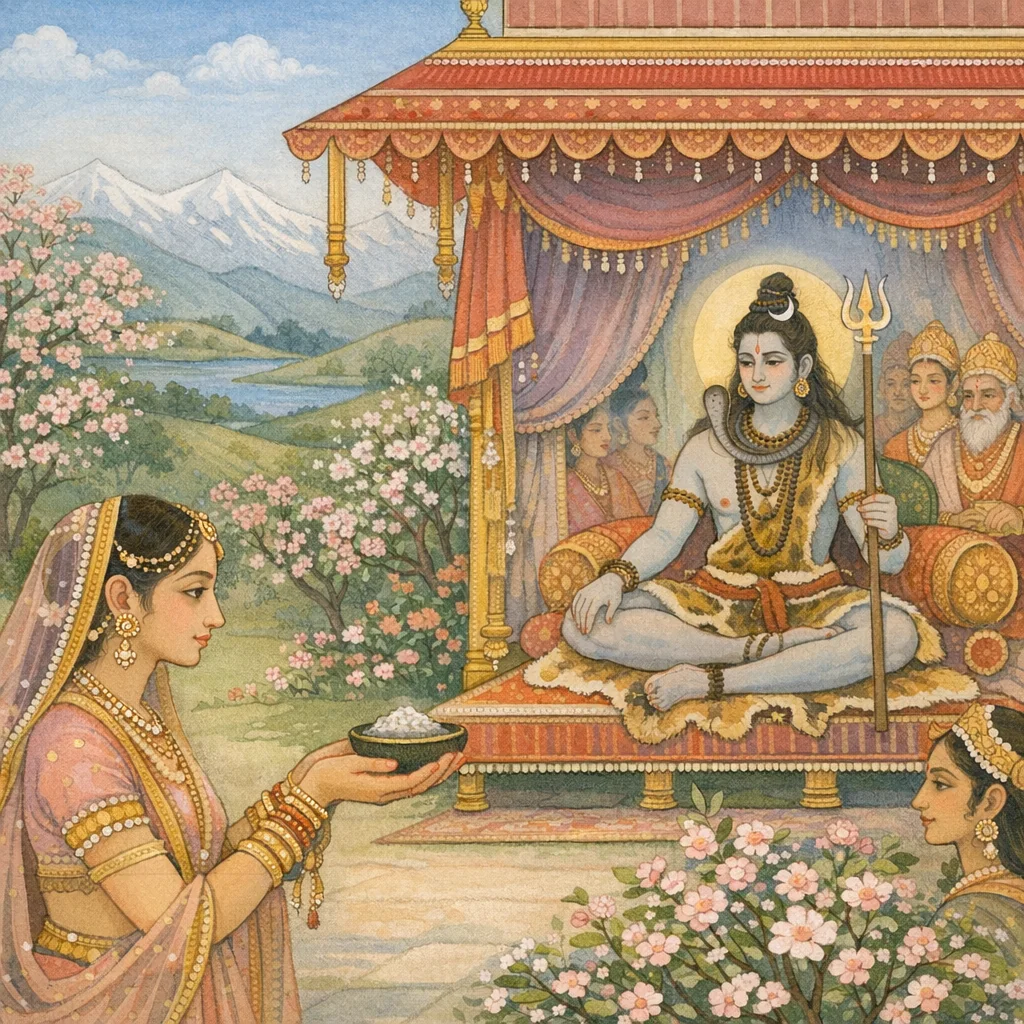 Dann setzte Śambhu in seiner Wohnstatt Pārvatī zu seiner Linken und speiste sie mit süßen Speisen; und auch sie, von Freude erfüllt, nahm davon zu sich.