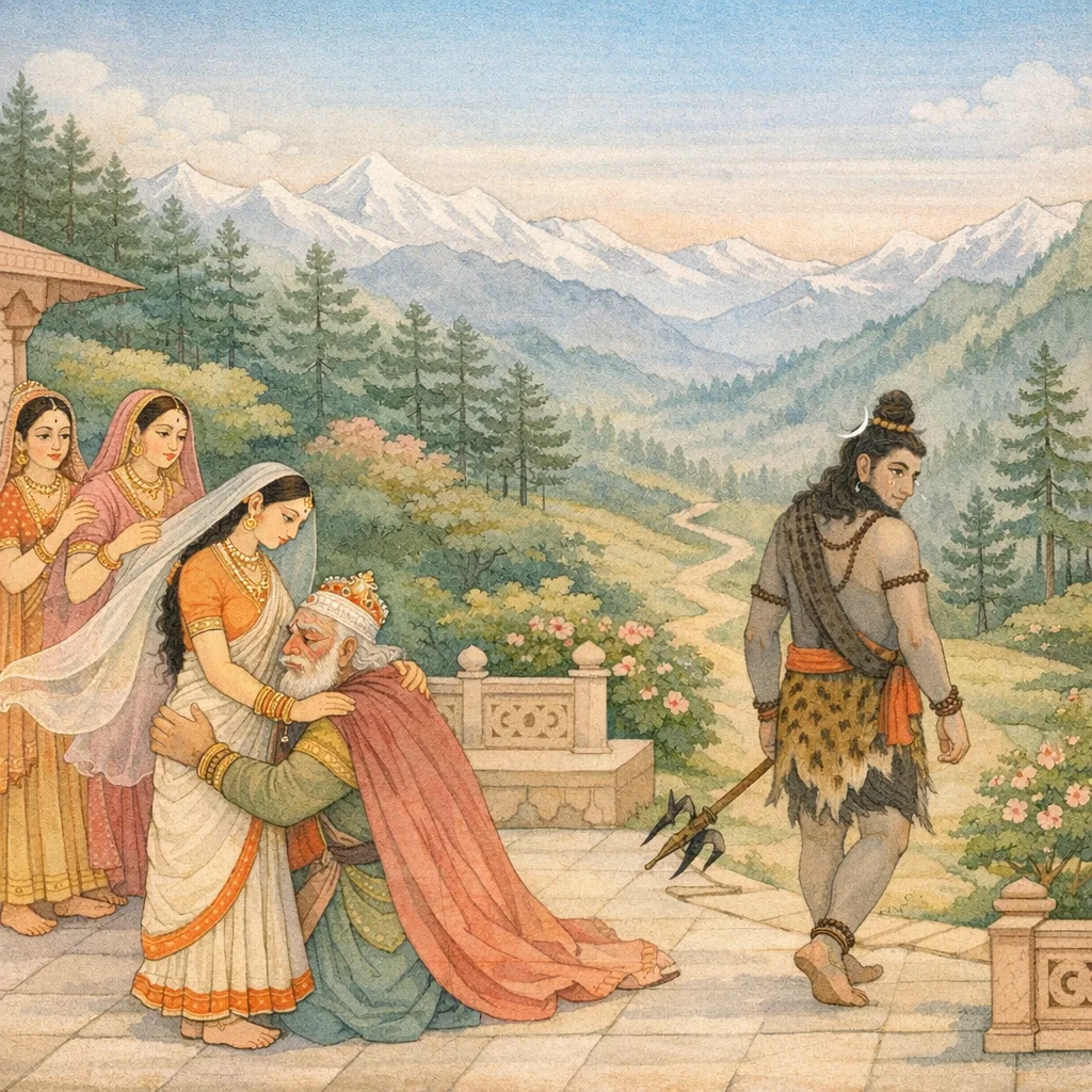 In Hingabe verneigte sich Pārvatī vor ihrer Mutter, ihrem Vater und den ehrwürdigen Ältesten. Dann brach Mahāmāyā, vom weltlichen Anhaften und den Gefühlen der Gewohnheit überwältigt, immer wieder in lautes Weinen aus.
